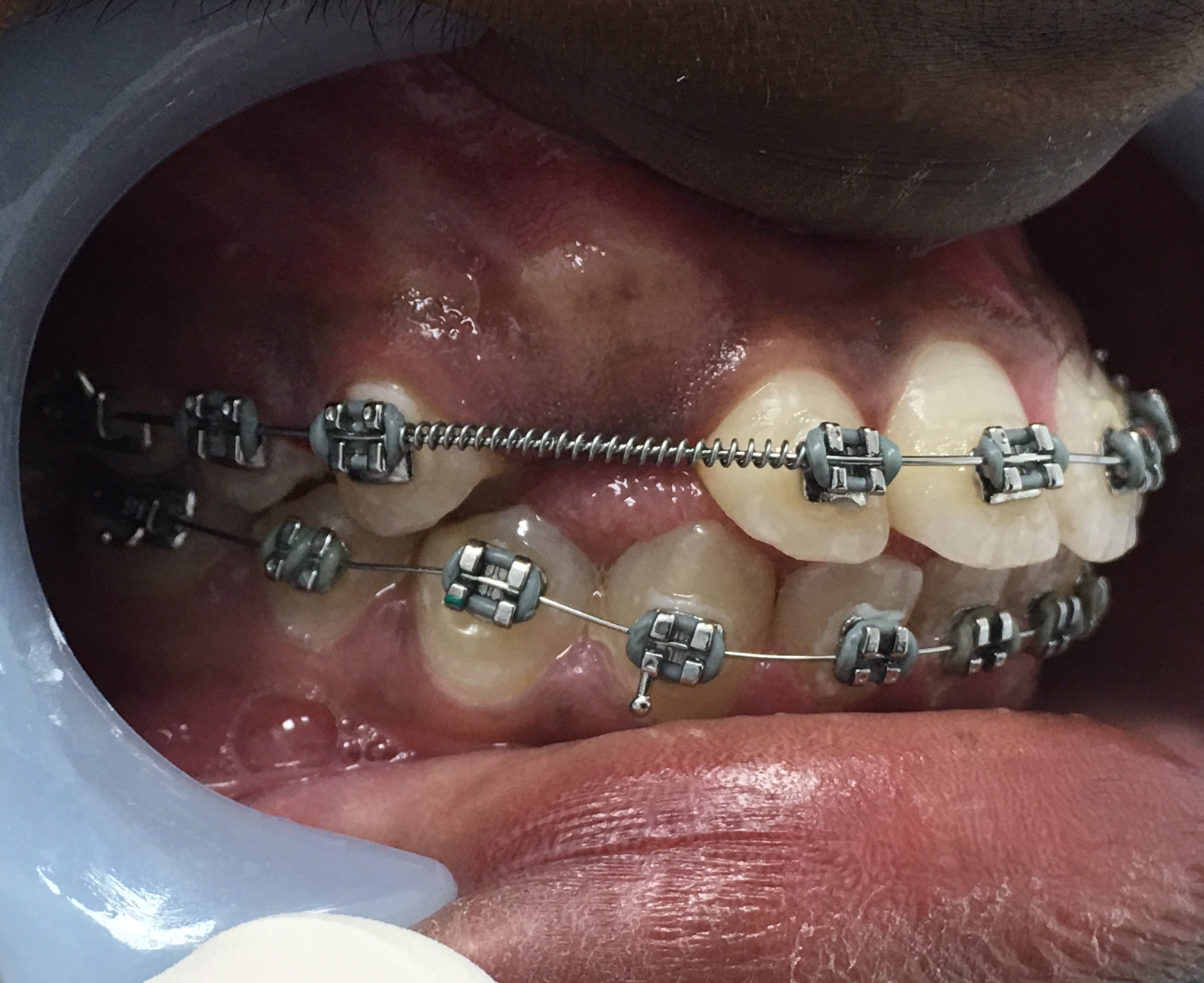 Gingival enlargement or hyperplasia is a common side effect of fixed orthodontic therapy, occurring in almost 10% of orthodontic patients.81,83 Gingival enlargement often impedes the maintenance of oral hygiene, causing esthetic and functional problems, and has been reported to compromise orthodontic tooth movement.81,84,85 Conventional treatment for gingival enlargement often includes oral hygiene instruction, scaling, root planing, and prophylaxis; however, extensive and often fibrotic gingival enlargement compromises self-care and may necessitate gingivectomy to maintain oral health.81,86 The adjunct use of diode laser gingivectomy can in a shorter amount of time further improve the gingival health of a patient with gingival enlargement.81 Figure 2 through Figure 5 depict a case of gingival hyperplasia that was successfully managed using diode laser.