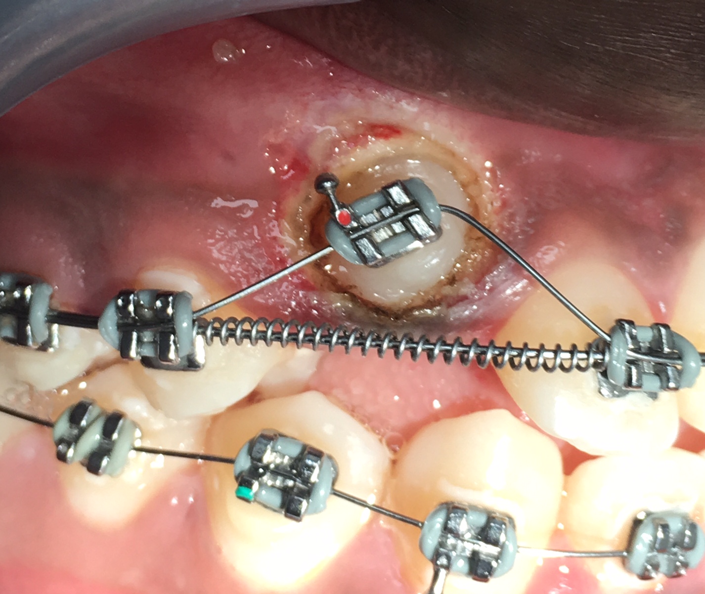 One of the interesting applications of diode lasers is for exposure of superficially impacted teeth, in particular maxillary permanent canines, which are the most frequently impacted tooth after third molars (0.92% to 4.3%).89,90 The conventional approach is to orthodontically create sufficient space for the impacted tooth and wait for it to erupt, which could delay treatment for months and adversely affect treatment efficacy. Alternatively, an apically positioned flap (buccally/labially positioned tooth) or full-thickness mucoperiosteal flap (palatally positioned tooth) could be raised using closed/open eruption techniques, and an orthodontic attachment subsequently bonded to the impacted tooth.77,91,92 This would involve use of a scalpel, leading to considerable bleeding and pain. Bonding orthodontic attachments requires a dry field and use of hydrophilic moisture-insensitive primers.92 The orthodontic traction should begin as soon as possible after exposure if the open eruption technique is not intended.92