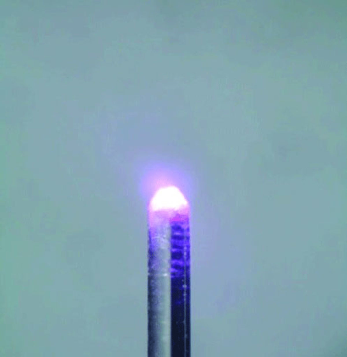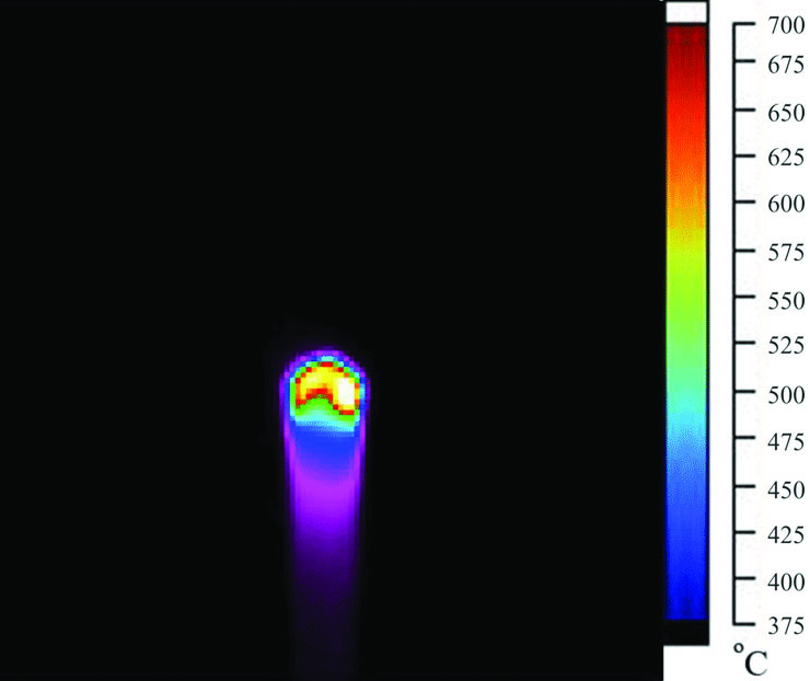 A part of the initial laser light is converted to optical power—polychromatic infrared light that radiates from the tip with wavelengths from about 1,400 nm to 11,000 nm. The tip is a quartz glass fiber with sintered particles and ions integrated into the glass structure, highly absorbing laser light. Figure 2 and Figure 3 show optical and thermal images, respectively, of a TOP tip. Laser irradiation is highly absorbed at the distal end of the tip, with the tip heating up to 500°C to 900°C (image in Figure 3 acquired with a thermal camera). The heated tip emits incandescent thermal radiation with spectrum and power as described by Plank’s law.15