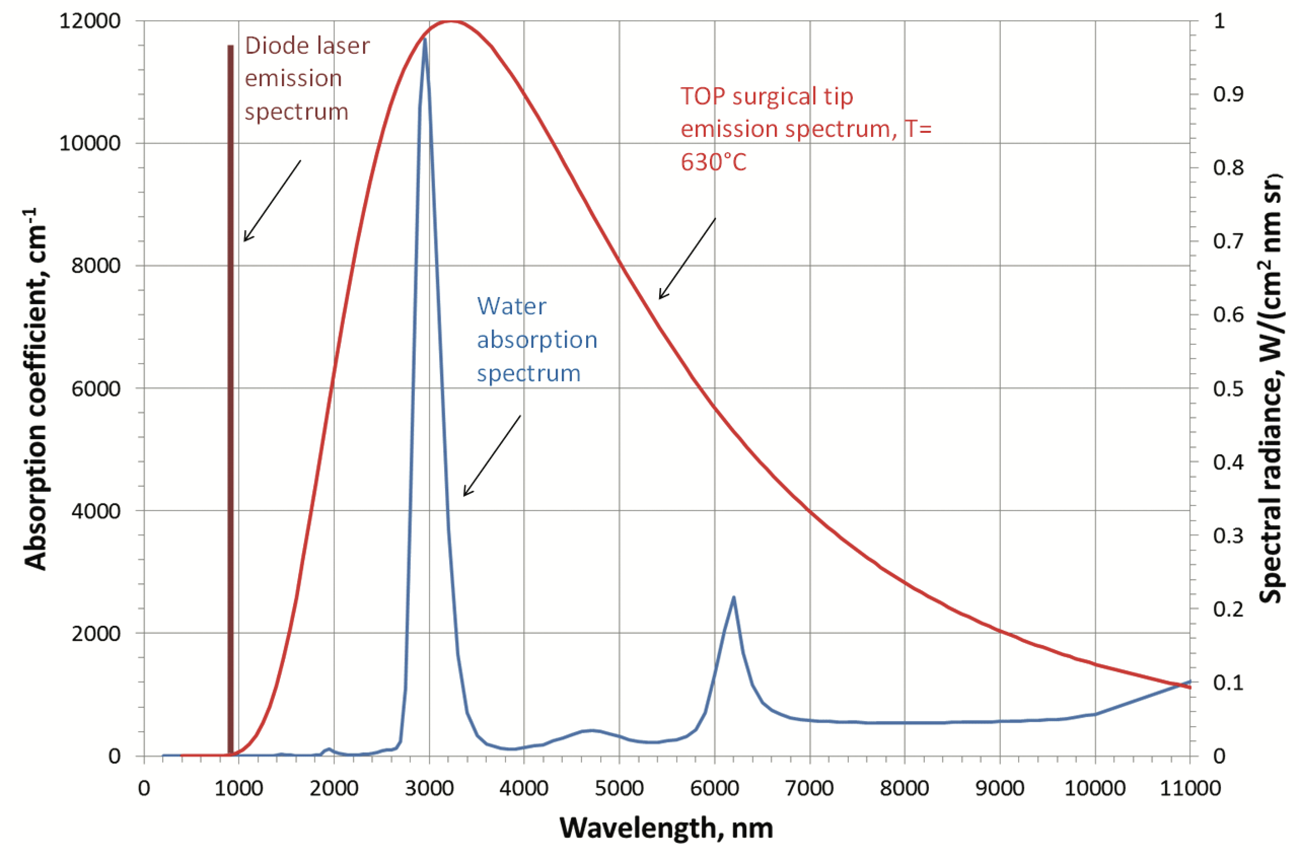 This radiation has a broad polychromatic spectrum with very little power in the visible range, resulting in an orange glow visible from the tip (Figure 2). Figure 4 shows a calculated spectrum of the TOP tip thermal radiation with a temperature of 700°C. These wavelengths of thermal radiation are highly absorbable by soft tissues because they are overlapping with high peaks of water absorption in the mid-infrared range. The average absorption coefficient for this polychromatic infrared radiation is in the range of 700 cm-1 to 850 cm-1, which is very close to the absorption coefficient of a CO2 laser (having a 10,600 nm wavelength and absorption coefficient of 630 cm-1),13 which is known for its excellent soft-tissue cutting and coagulation capabilities. The absorption of this emitted optical radiation by soft tissue during cutting has an enhancing effect on the cutting and cauterizing power of the TOP surgical system. The result is that the laser tip will cut faster and cauterize tissue for hemostasis more effectively because the optical power emitted from the tip produces a CO2 laser-type tissue effect. The tip works as a wavelength energy converter, transforming poorly absorbed near-infrared light from a diode laser with a wavelength of about 980 nm and tissue absorption coefficient of about 0.5 cm-1 to a highly absorbed mid-infrared thermal radiation with a wavelength of 1,400 nm to 11,000 nm and an average tissue absorption coefficient of about 700 cm-1 to 850 cm-1 (Figure 4).