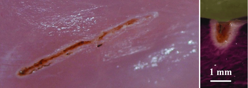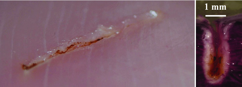A core functionality of the TOP surgery system is the ability to precisely maintain constant temperature at the tip independent of the speed of the surgeon’s hand. This is made possible by a real-time temperature sensing and adjustment system. The temperature selected by the operator is maintained independent of the speed of movement through the tissue or the type and consistency of the tissue—a fundamental advancement in thermal cutting. This regulating mechanism dramatically reduces the effect of the movement speed as a variable. The cutting effect and the zone of thermal necrosis are constant for each temperature setting used, which significantly reduces the variability of depth of cut and collateral thermal damage due to changes in speed of movement. When necessary, this automatic power control delivers more power for fast cutting or cutting of fibrotic tissue, and minimizes power output for reduced cutting speeds to protect the patient. The TOP automatic power control (Figure 5) produces a deeper cut with minimal collateral thermal damage versus a cut performed with fixed power (Figure 6). Additionally, for safety the surgery system is capable of sensing a stop in hand movement and shuts down the power to avoid tissue overheating.