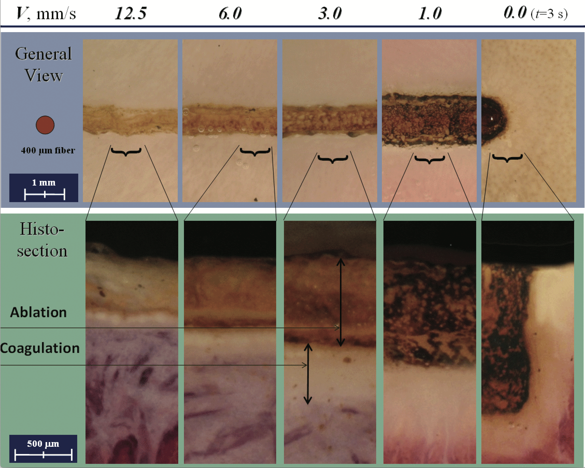 The images shown in Figure 7 and Figure 8 represent a series of photos (top row) and histology (bottom row) of soft-tissue cutting at five different speeds of movement, ranging from 12.5 mm per second to 0 mm per second (stop for several seconds) performed with a traditional diode laser using fixed power (Figure 7) and TOP surgery with automatic power control (Figure 8).13 These experiments were performed using a translation stage with programmable speed and controlled vertical force between the fiber and the sample. To visualize tissue damage, nitro blue tetrazolium chloride (NBTC) viability staining was used, so stained areas show live cells, while cells in white areas are dead. This stain became a standard tool to visualize tissue thermal damage in laser surgery.16,17 It is characteristic that when the speed decreases, the cutting depth and level of collateral tissue damage and carbonization increase sharply for diode lasers, but they remain essentially the same with the new laser technology. The histological evaluations (Figure 7 and Figure 8) illustrate how the influence of cutting speed can reduce tissue damage with automated power control.