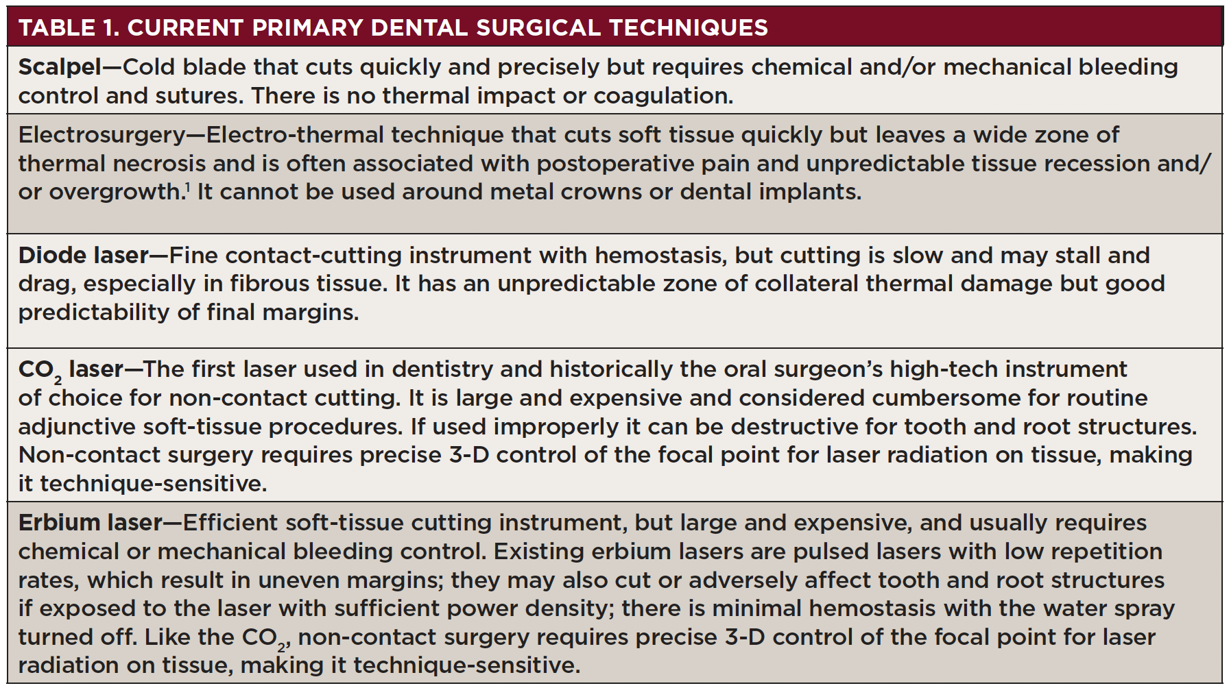 Instruments used today to perform dental surgical techniques have evolved over hundreds of years, starting with the scalpel in the 1800s, electrosurgery in the 1920s, and various types of lasers over the course of the past 25 years. Besides the scalpel, today’s primary forms of instrumentation include electrosurgery, diode lasers, carbon dioxide (CO2) lasers, and erbium lasers (Table 1). No one instrument is capable of fulfilling all the needs of dentists and patients for the entire range of surgical procedures. In fact, the optimal surgical instrument would have to comply with patient demand for comfortable procedures with esthetically appealing results and with the dental practitioner’s need for efficiency with predictable outcomes.