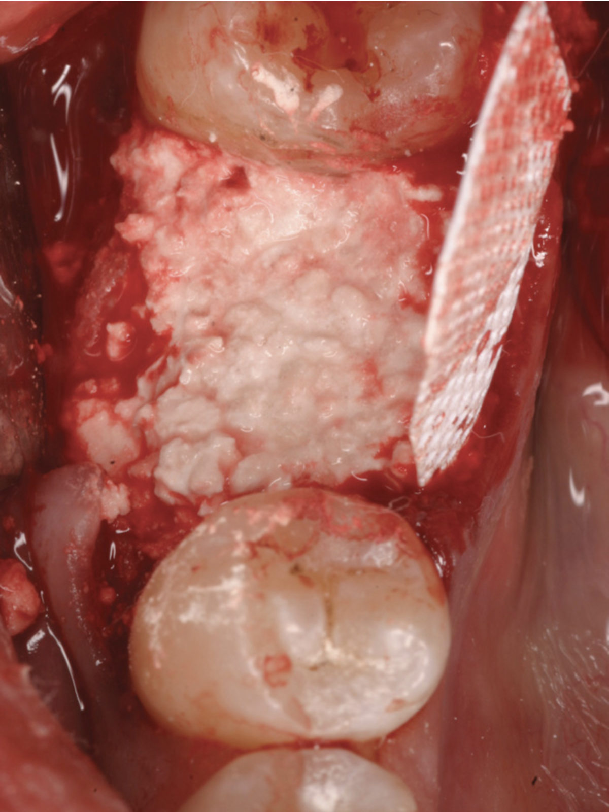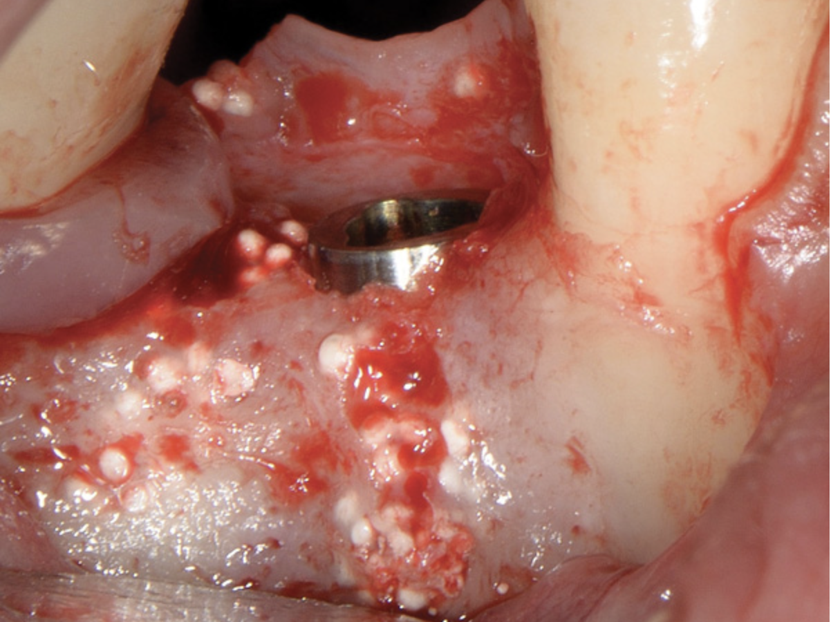 Fig 1. A significant loss of bone necessitated covering the BPCS with a dense PTFE barrier.