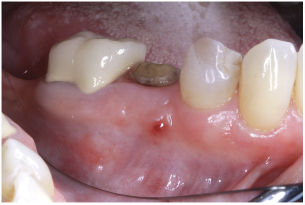 Peri-implant infections may be chronic or acute. An acute infection is similar to a periodontal abscess, but is usually circumferential around an implant.