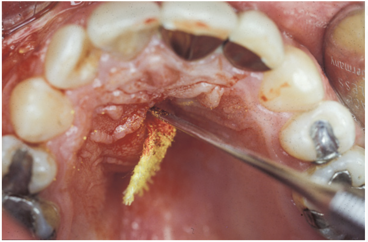 If a flap needs to be elevated to remove a tooth, implant, or granulomatous tissue, incision placement must take the following points into account: anatomical considerations; adequate size; broad base for the flap; and margins should be made on sound bone.33 In addition, to allow for sufficient drainage, it is best to avoid primary closure. As tissues that are infected become friable due to the increased number of inflammatory cells and decreased collagen, suturing infected tissue requires taking a large bite of tissue so the suture does not pull though the wound’s edge. Furthermore, when treating an infection in conjunction with a therapeutic intervention, especially when general symptoms of infection are manifested, recommendation should be made with respect to analgesics, hydration, nutritional support, and anti-inflammatory drugs.