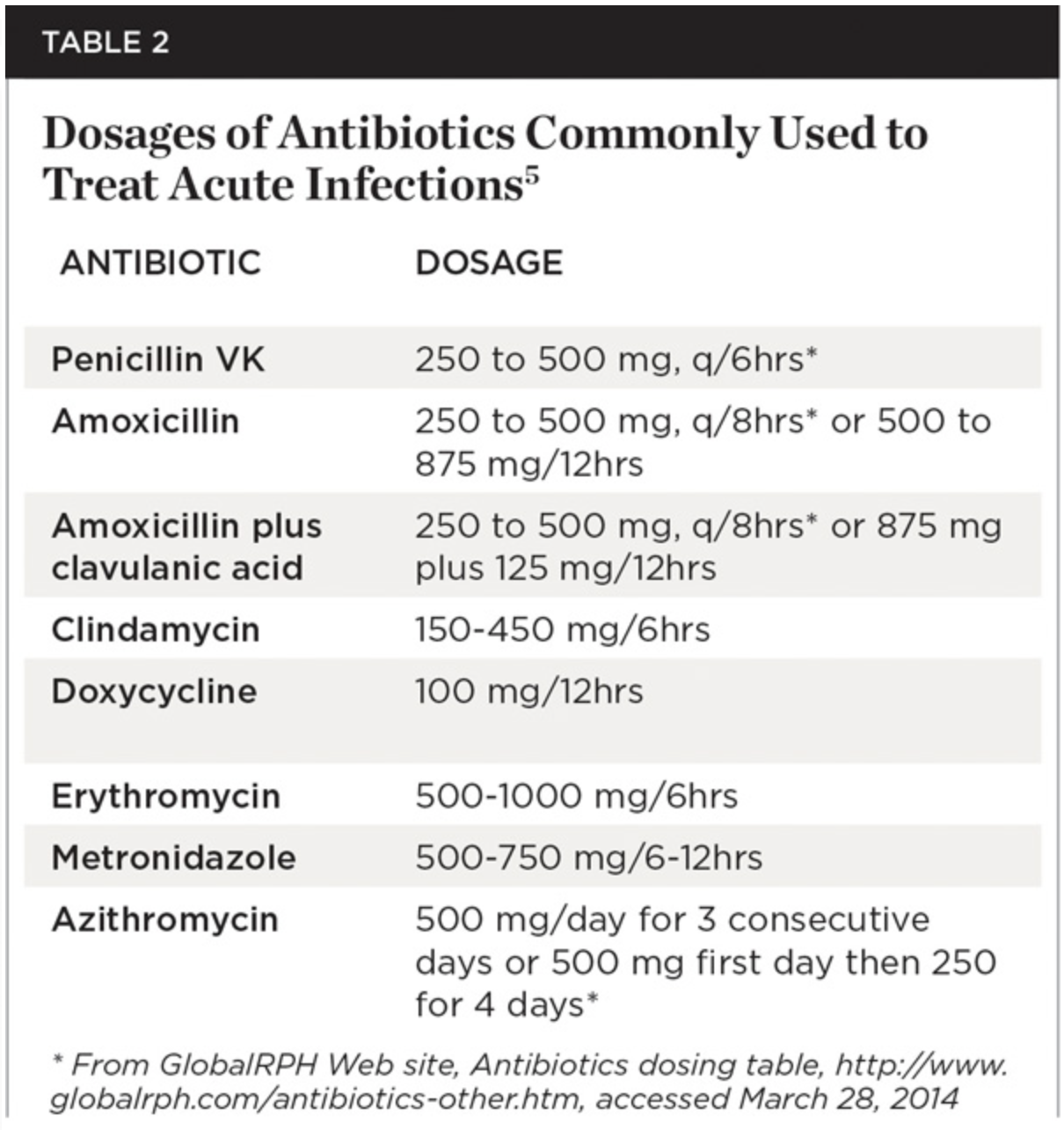 Other issues surrounding antibiotics commonly used to treat infection include treatment duration, bacterial resistance, and combination therapy. (Dosages of antibiotics commonly used to treat acute infections are found in Table 2.)5