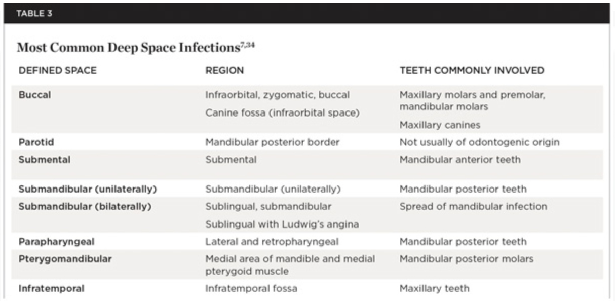 In the maxilla, an infection can extend into the vestibular, buccal, canine, and infratemporal spaces and palatal areas (Table 3). In the mandible, an infection can also spread into the vestibular, submental, sublingual, submandibular, pterygomandibular, and parapharyngeal spaces (Table 3). Failure to promptly manage cellulitis can result in life-threatening sequelae: cavernous sinus thrombosis, septicemia, airway obstruction, and mediastinitis.7 Osteomyelitis and bone sequestration are also possible complications of untreated infections. Patients who are swollen and experience trismus and pain upon swallowing need aggressive therapy. Specific warning signs of an unresponding cellulitis include dysphagia, dyspnea, trismus, and progressive swelling.7 If there is an inadequate response to initial therapy, or the signs and symptoms of the infection are advanced, these patients should be referred to an oral surgeon and possibly be hospitalized.