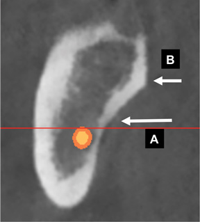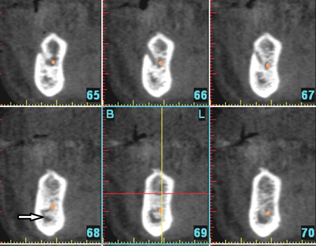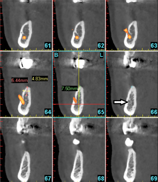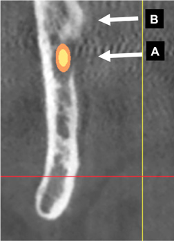 When examining a CBCT scan, the clinician has the responsibility to examine every cross-section to ensure that no pathosis is overlooked. It is suggested, though not mandatory, to begin viewing the last section on the left side (this corresponds to the patient’s right side) and proceed anteriorly examining one slice (also referred to as a cut or cross-section) at a time.4 Cross-sectional cuts are usually 1-mm thick but can vary depending on the software.4 At the periphery of each cross-sectional cut there are millimeter markings horizontally and vertically that facilitate measuring the dimensions of structures. The computer also can be used to perform measurements of structures and edentate spaces. The use of radiopaque markers (eg, barium sulfate) at the time of scanning facilitates measurements at specific sites. In conjunction with a radiographic assessment, a thorough clinical examination should be conducted. In addition, when possible, anatomic structures should be palpated and restorative space (eg, vertical height and horizontal width) of edentulous areas measured.