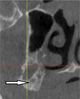 Lateral wall: This wall provides access for the sinus graft procedure. A small radiolucency in the buccal plate indicates the presence of a blood vessel (Figure 19). After a failed sinus lift, a CBCT scan may demonstrate a large fenestration in the buccal plate of bone (Figure 20). To accomplish a sinus lift in this region, a split-thickness flap needs to be elevated, and the connective tissue left over the window needs to be pushed into the sinus because it is attached to the re-formed Schneiderian membrane.19 Figure 21 depicts a completed sinus lift procedure where the bone that was inserted did not reach the medial wall of the sinus.