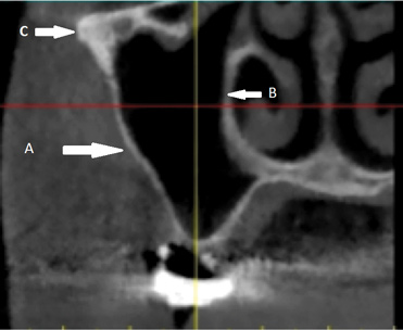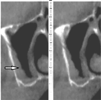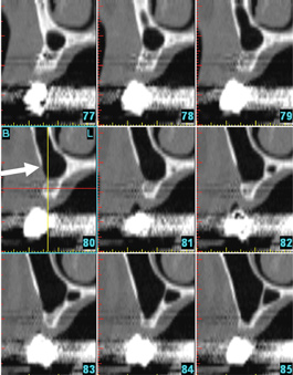 Sinus floor (Figure 16): It may extend in between the roots of the maxillary molars. If a sinus lift is performed and a fenestration in the bony floor of the sinus is detected on the CBCT scan (Figure 17), then a flap needs to be elevated on the ridge and the tissue protruding into the ridge needs to be pushed into the sinus.19 Otherwise, when the Schneiderian membrane is elevated internally, the membrane will tear in this region. Sometimes a pseudocyst can appear on the floor of the sinus (Figure 18).