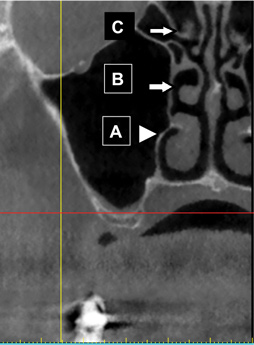 Septa are projections of bone into the sinus, and they may partially or completely compartmentalize the maxillary sinus (Figure 19). They have been located in 31% of maxillary sinuses in the premolar area and usually do not compartmentalize the antrum.21 Septa are usually found adjacent to the medial wall of the sinus. When they are present within the operative field of a lateral window or transcrestal sinus lift procedure, they increase the risk for membrane perforation when the membrane is elevated. (Note: Septum is the singular form of septa [plural].)