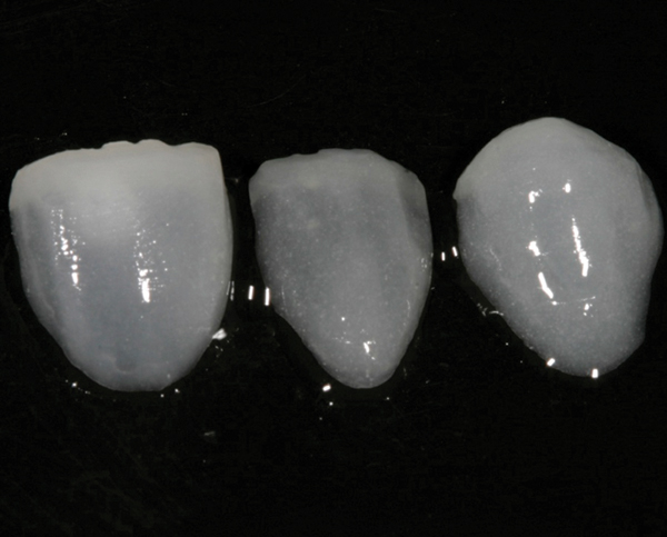 Like all CL-II materials, which have come to be known as glass ceramics, CL-IIa materials can be used for the same indications as CL-I materials—including anterior teeth, bicuspids, and, on rare occasions, molars. Additionally, they have documented long-term clinical success in higher stress situations or when more dentin is exposed. They may be highly translucent, but traditionally they have required slightly thicker dimensions for workability and esthetics/shade matching (ie, minimum working thickness of 0.8 mm if layered with a veneering porcelain) (Figure 7 and Figure 8).20,21