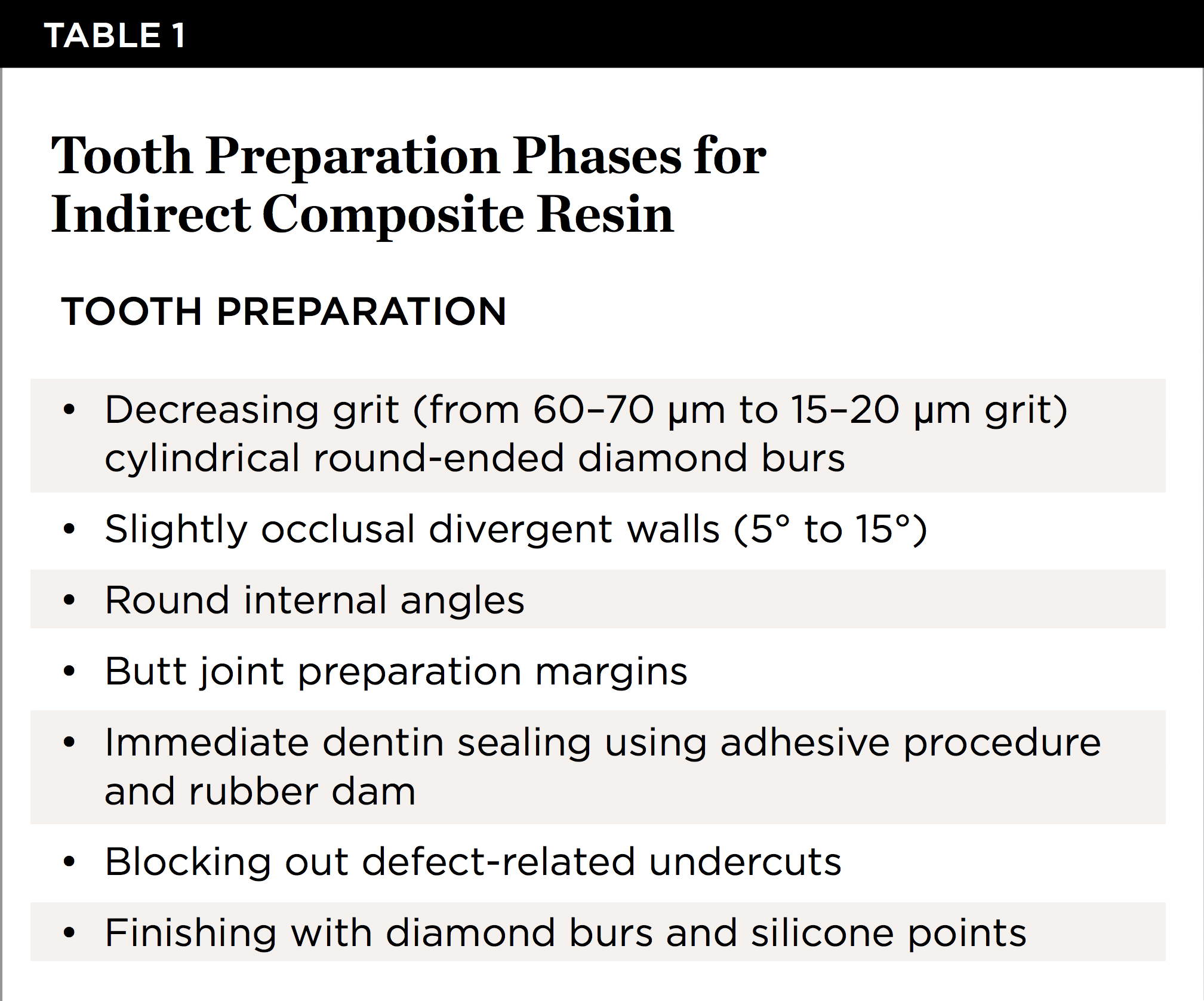 After caries and/or failed restoration removal, a cavity with slightly occlusal divergent walls (5° to 15°) and round internal angles is prepared by using decreasing grit (from 60–70 µm to 15–20 µm grit) cylindrical round-ended diamond burs. Preparation margins are not bevelled but prepared via butt joint.2 After cavity preparation and before cavity finishing, adhesive procedures are performed36 using a rubber dam in order to achieve an immediate dentin sealing.37,38 In keeping with rubber dam placement for subsequent restoration placement, the interproximal margin must be supragingival. To avoid a dual marginal leakage, no direct composite is used for gingival margin rebuilding.39 If any deep subgingival margin persists after cavity preparation—thus precluding proper rubber dam placement—the feasibility of a surgical crown-lengthening procedure and/or an orthodontic extrusion must be considered.40 A light-curing composite filling material is used to block out defect-related undercuts.2,41 The finishing phases are performed with diamond burs with a slight taper and with silicone points (Table 1). The teeth are protected with temporary eugenol-free restorations after impression making.42