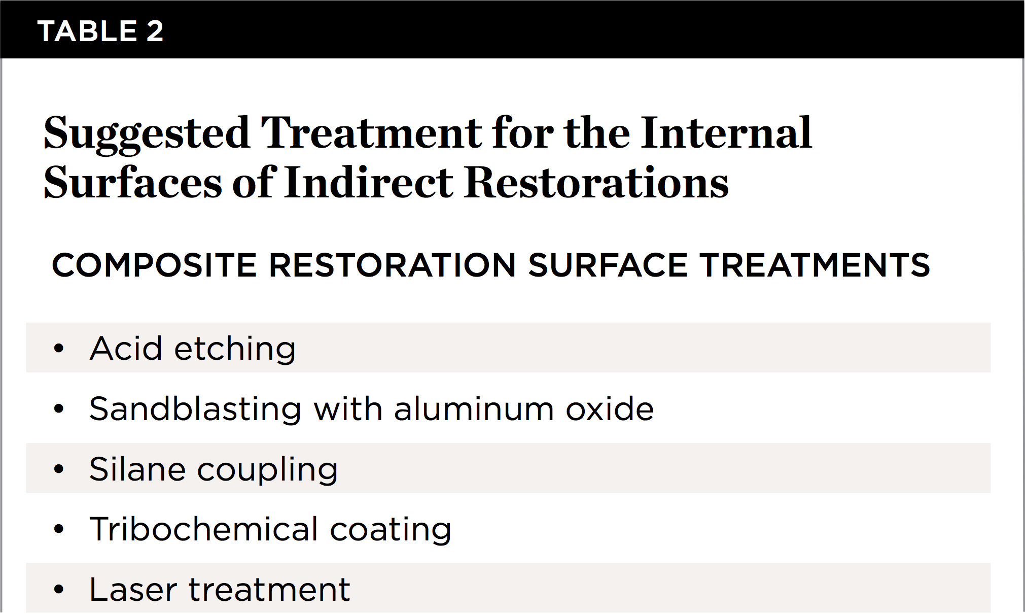 Several techniques have been suggested for increasing bond strength, involving treating the internal surfaces of indirect restorations (Table 2).54,55 The surface treatments aim not only to achieve a high retentive bond strength of the restoration, but also to avoid any microbiological leakage.56 Composite surface treatments are necessary for adhesion of indirect composite restorations.57 Acid-etching with phosphoric acid, acidulated phosphate fluoride, or hydrofluoric (HF) acid is one of the treatments reported in literature.58-60