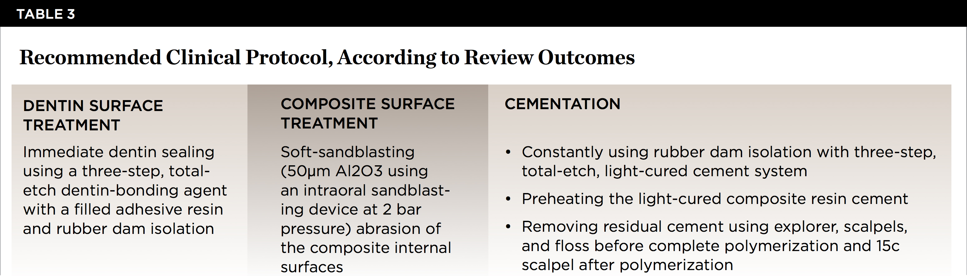 The constant use of rubber dam isolation is necessary for the cementation protocol with adhesive systems. Removing residual cement using explorers, scalpels, and floss before complete polymerization, and a 15c scalpel after polymerization, is recommended in order to avoid compromising restoration marginal accuracy, compared to the use of burs, discs, or strips (Table 3).2