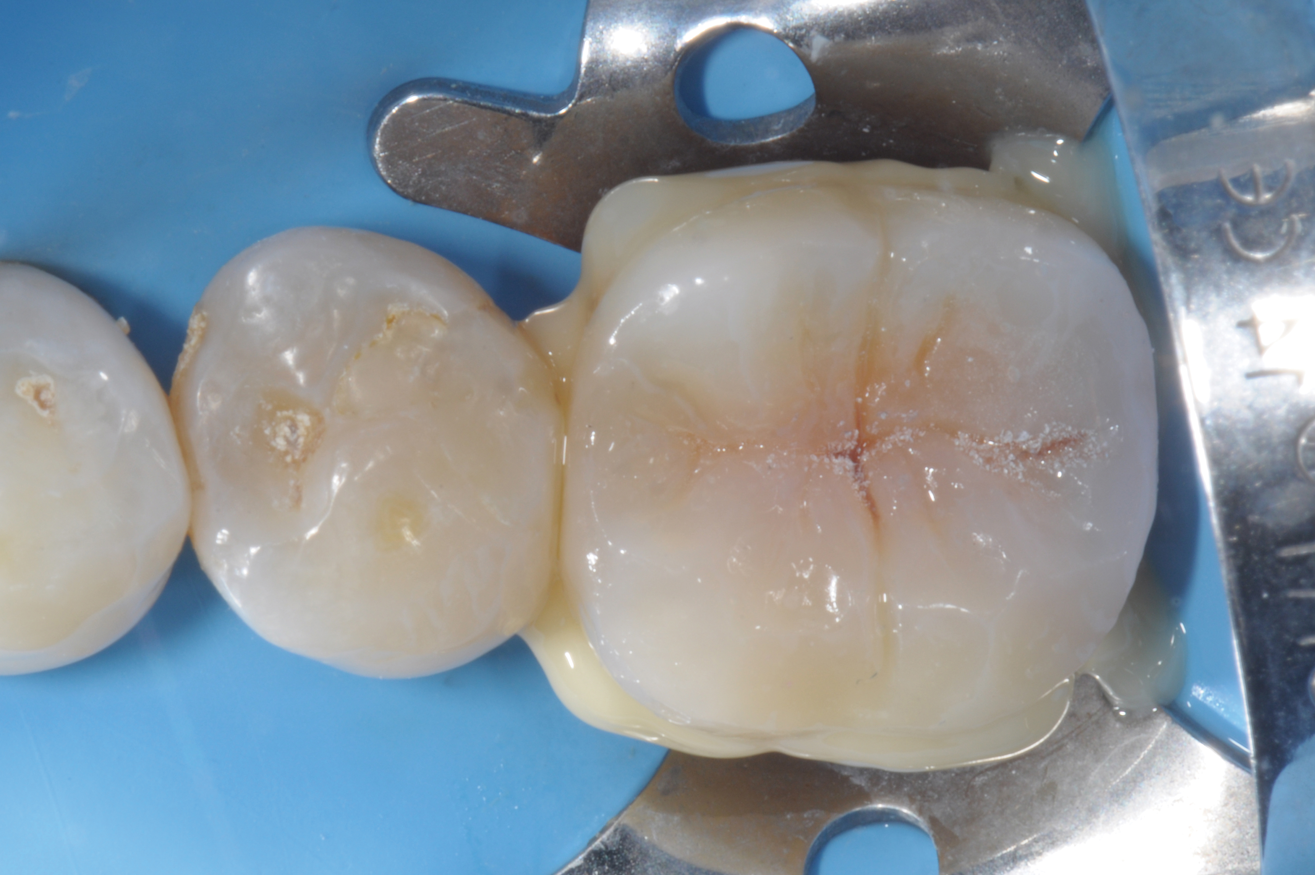 When following a protocol of cementation using an adhesive system, constant rubber dam isolation and careful hand finishing are necessary to provide predictable clinical results (Figure 1 through Figure 4).2