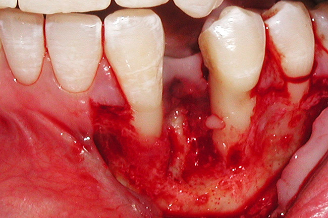 Because of the apparent bone loss, seen on the radiograph, on the mesial of tooth No. 21 and the distal of tooth No. 22, one suggestion was to remove teeth Nos. 21 and 22 and, subsequently, site-develop the regional anatomy for implant placement. The surface area requiring GBR was expected to be rather large, whereby autogenous bone grafting from the chin would have been elected to augment the site in both the horizontal and vertical dimensions. Following 6 months of healing, implant placement would ensue at either position, Nos. 21 or 23, to be restored as a bridge or at position Nos. 21 through 23 for individual implant restorations.
