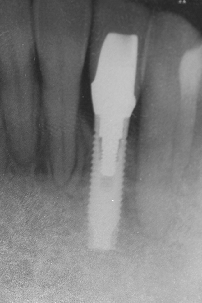 A 28-year-old Caucasian female presented to the periodontist with a complaint of a mobile implant in the site of tooth No. 22 (Figure 2 and Figure 3). The patient had a congenitally missing tooth No. 23. No. 22 had erupted into site No. 23, leaving a vacancy at site No. 22, and was the reason for the original implant at site No. 22.