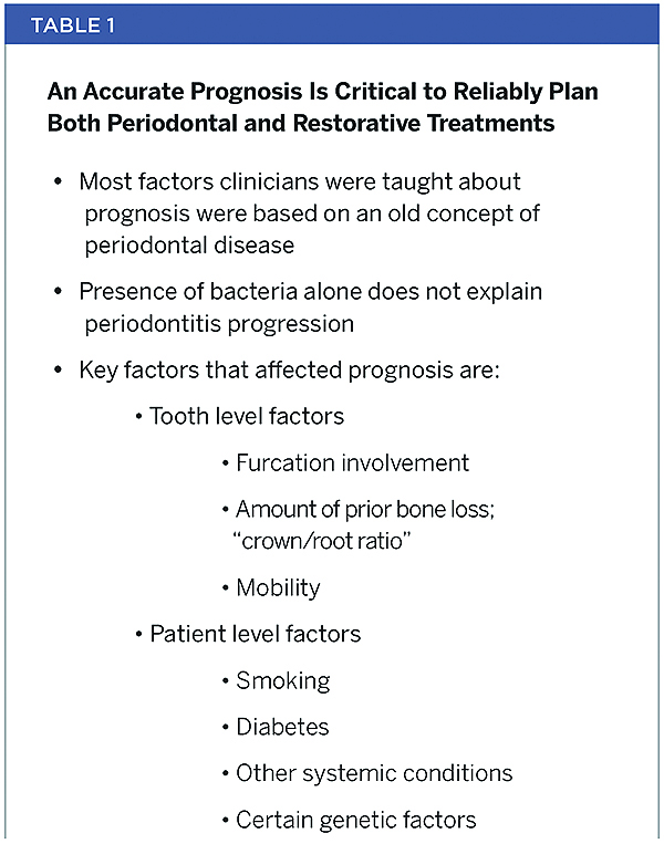 The basis for prediction is the understanding and proper assessment of risk factors for individual patients prior to disease development. Risk factors provide an objective means by which to formulate a patient-specific prognosis (Table 1)—ie, a prediction of the future course and/or outcome of a disease, treatment, or no treatment, given current information.1 Dentists must rely on their knowledge and experiences to thoroughly evaluate a patient’s condition and his/her risks, and then make recommendations for the best future of that patient. Prognoses must be patient-specific to reap the full benefits of this principle.