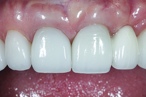 The crown was inserted and secured with a luting composite (Multilink® Automix, Ivoclar Vivadent) (Figure 17); a radiograph confirmed complete removal of excess cement (Figure 18). At the 4-month follow-up appointment, the soft tissues were healed within normal limits, and the patient was pleased with the esthetic outcome of the definitive restoration (Figure 19 and Figure 20).