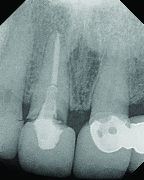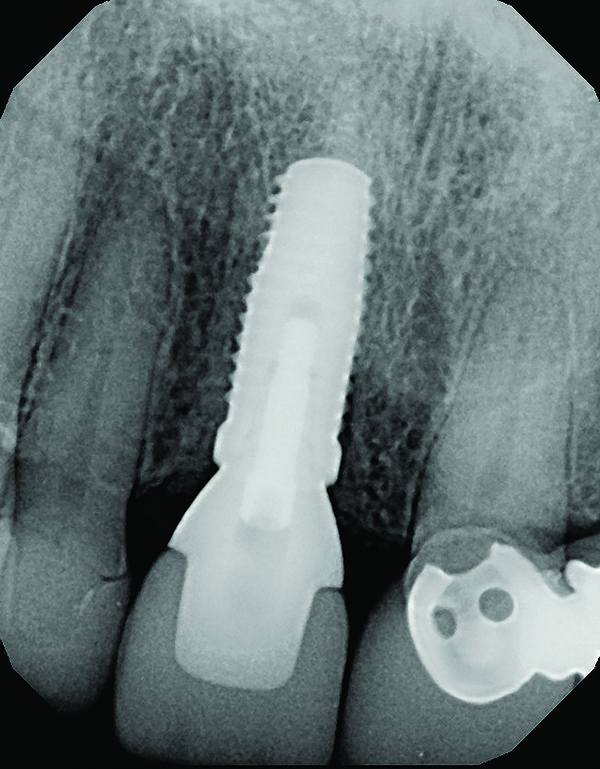 A 63-year-old female patient presented with mobility of her right maxillary incisor, tooth No. 8, secondary to endodontic therapy (Figure 1). Her medical and dental histories were non-contributory. Clinical and radiographic evaluations revealed an 8-mm probing depth on the palatal aspect. The tooth was deemed to be fractured (Figure 2). The treatment plan accepted by the patient was for extraction, immediate implant placement, and immediate provisional restoration, if possible.
