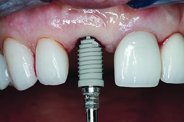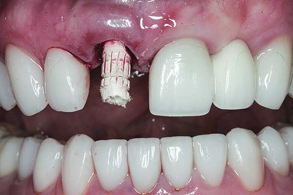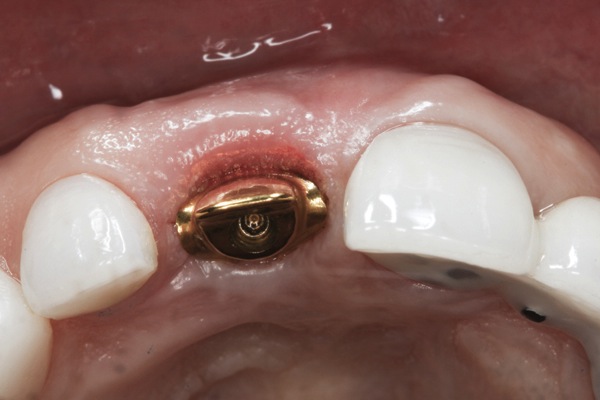 The following case report illustrates the clinical results obtained with a gold-colored, titanium-nitride–coated abutment and platform-switched implant placed in the anterior maxilla.