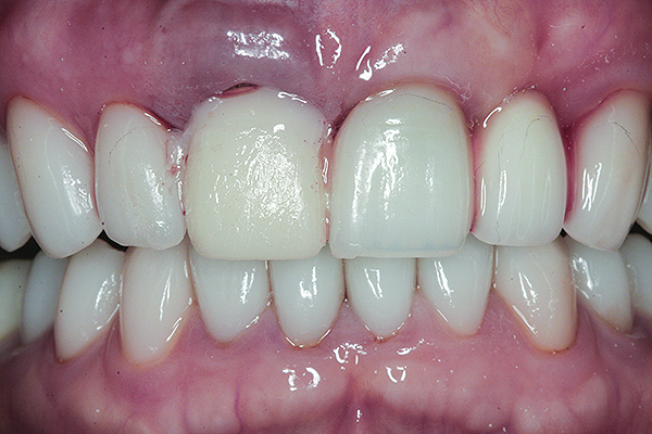 The master cast and abutment were returned to the laboratory for fabrication of the restoration (Figure 15). An all-ceramic crown (e.max®, Ivoclar Vivadent) was fabricated on the custom abutment; it matched the contours of the adjacent central incisor. After completion of custom shading, the definitive abutment and crown were returned to the restorative dentist. The abutment was tried in (Figure 16), and a radiograph was taken to confirm complete seating between the abutment/implant and the crown/abutment. The definitive abutment screw was torqued to 20 Ncm, and the screw-access opening was blocked out with Teflon tape.