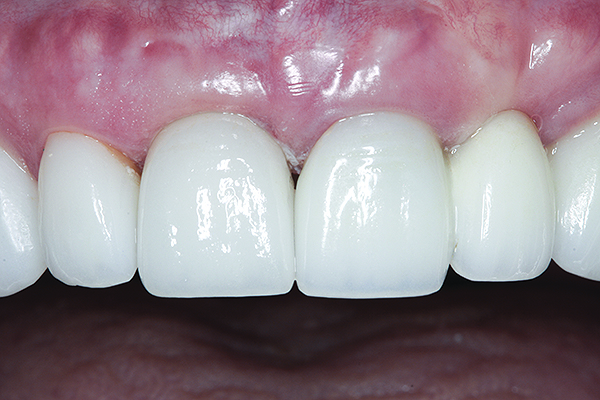 While all-ceramic tooth- and implant-supported restorations have become increasingly prevalent, the esthetic results of all-ceramic restorations cemented over metallic implant abutments may be questionable. Sailer et al recommended that when choosing abutments for anterior single-unit cases, several factors should be considered, including smile-line height, soft-tissue thickness, the color of the neighboring teeth, and the patient’s esthetic expectations.30 For esthetically demanding situations, customized ceramic abutments were recommended. For patients with thin peri-implant soft tissues, a combination of zirconia abutments and all-ceramic crowns were recommended. In cases with thick mucosa, titanium abutments could be used, when combined with metal-ceramic crowns. To avoid difficulties with retained cement, Sailer et al also recommended the use of screw-retained restorations whenever screw-access openings could be positioned palatal to the incisal edges of the implant restorations.