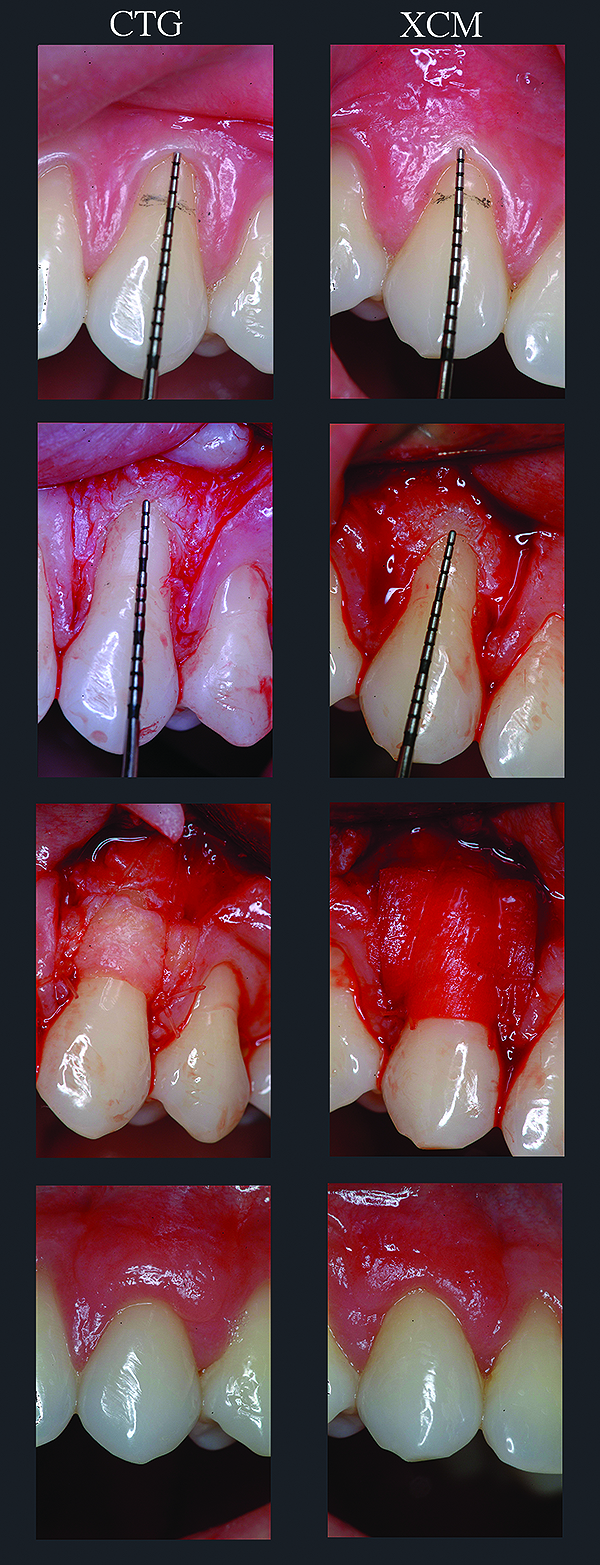 In the author’s study of XCM+CAF for root coverage,24 the team followed 25 patients for 12 months, again using contralateral, within-subject, matched defects to compare the test therapy against the gold standard CTG+CAF (Figure 8). While recession depth (and hence, root coverage) was the primary efficacy endpoint, the author and his coinvestigator also followed traditional clinical parameters such as KT width, along with PROs such as color/texture esthetics, satisfaction, and pain/discomfort.