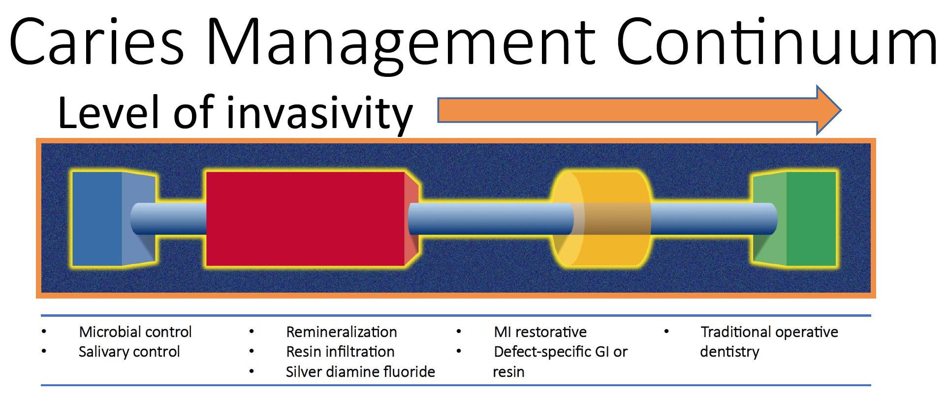 The caries management continuum (Figure 1) has been developed to indicate the level of invasiveness of caries lesions. On the left side of this continuum are microbial control treatments and salivary control treatments. On the far right of this continuum is traditional operative dentistry. In between are less-invasive forms of treatment, such as remineralization therapies, resin infiltration, and the newly introduced silver diamine fluoride, along with the next stage of intervention: minimally invasive restorative dentistry, which has been the trend for some time, and defect-specific glass-ionomer/resin composite combinations that are less invasive in nature.8