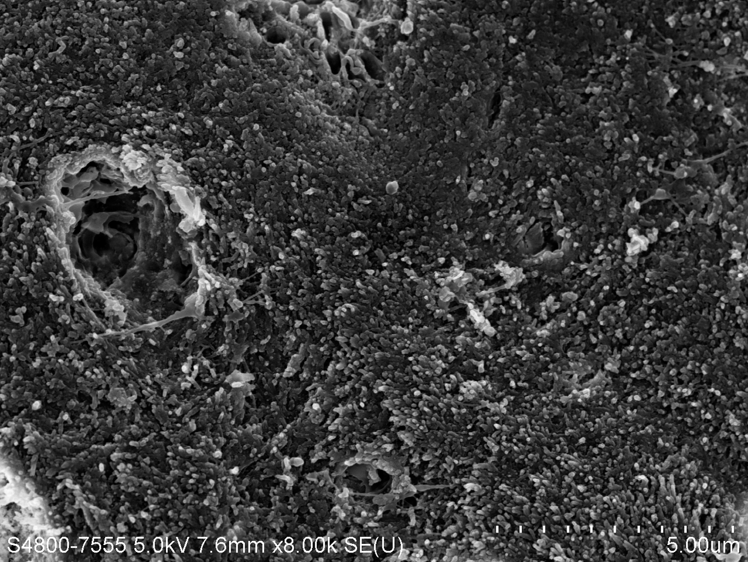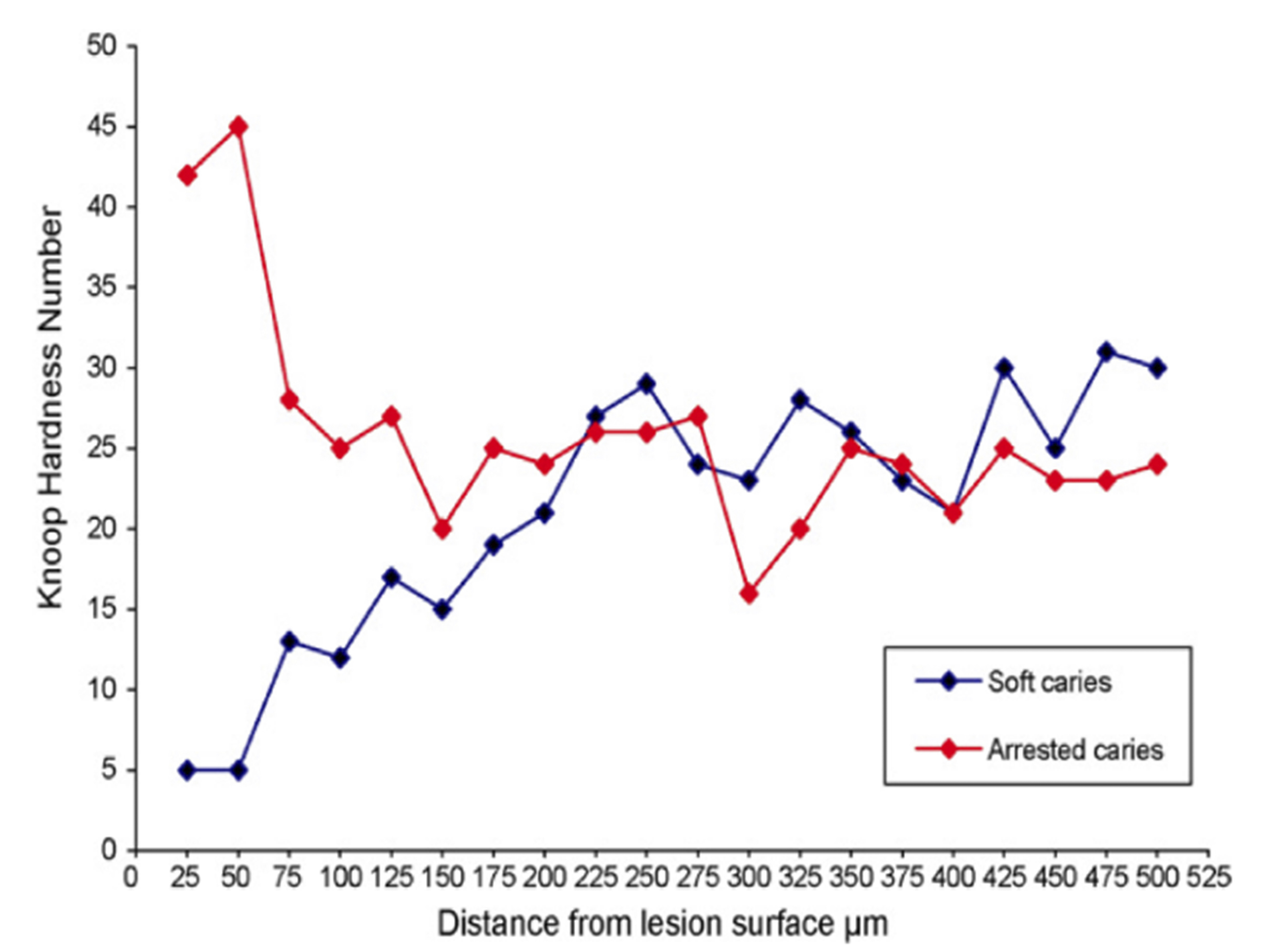 There are several advantages of using SDF in dental treatment. First, it showed an antimicrobial activity against mono-species, dual-species, and multi-species cariogenic biofilm.14-16 Silver ions are bactericidal metal cations that inhibit biofilm formation.17 Studies have indicated that silver interacts with sulfhydryl groups of proteins and DNA, thus altering hydrogen bonding and inhibiting respiratory processes, DNA unwinding, cell-wall synthesis, and cell division.18 At the macro level, these interactions affect bacterial killing and inhibit biofilm formation.17 Second, fluoride promotes caries lesion remineralization. Fluoride has been indicated to react with hydroxyapatite and generate calcium fluoride, which is a reservoir of fluoride, and facilitate further remineralization.19 An ex vivo study reported surface microhardness of the surface layer of the arrested caries after SDF applications was comparable with the unaffected sound dentin20 (Figure 1 and Figure 2). This is consistent with another study, in which a high remineralized zone was observed on the surface of arrested caries from exfoliated teeth with SDF treatment21 (Figure 3 and Figure 4). Third, its application procedures are simple and do not require injection or drilling, and the treatment does not involve expensive support infrastructure equipment such as piped water and electricity. The simplicity of the treatment is conducive to treating caries in apprehensive young children who may have intense dental fear, uncooperative patients with special needs, or elderly patients who have difficulty adapting to traditional dental care. It also allows trained workers to deliver the treatment to people who live in the area but who may not be able to easily access dental service.22 Patient compliance and satisfaction is often good when the patient is provided a clear explanation of the treatment outcome.23,24 Finally, the cost of SDF treatment is low and should be affordable in most communities.