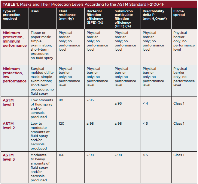 ASTM International, formerly known as American Society for Testing and Materials, is an international standards organization that develops and publishes voluntary consensus technical standards for a wide range of materials, products, systems, and services. Recognized by the US Food and Drug Administration (FDA), ASTM International has long been one of the largest standards organizations for the testing of face masks.2ASTM Standard F2100-11 is the specification for performance of the materials in medical face masks. This standard covers the testing and construction requirements used in the masks as well as the masks' medical performance. Masks can vary in protection level from serving as a simple barrier to providing stronger protection during procedures where heavy amounts of fluids may be involved; beyond the basic minimum protection masks, there are three stronger levels of protection (Table 1).
