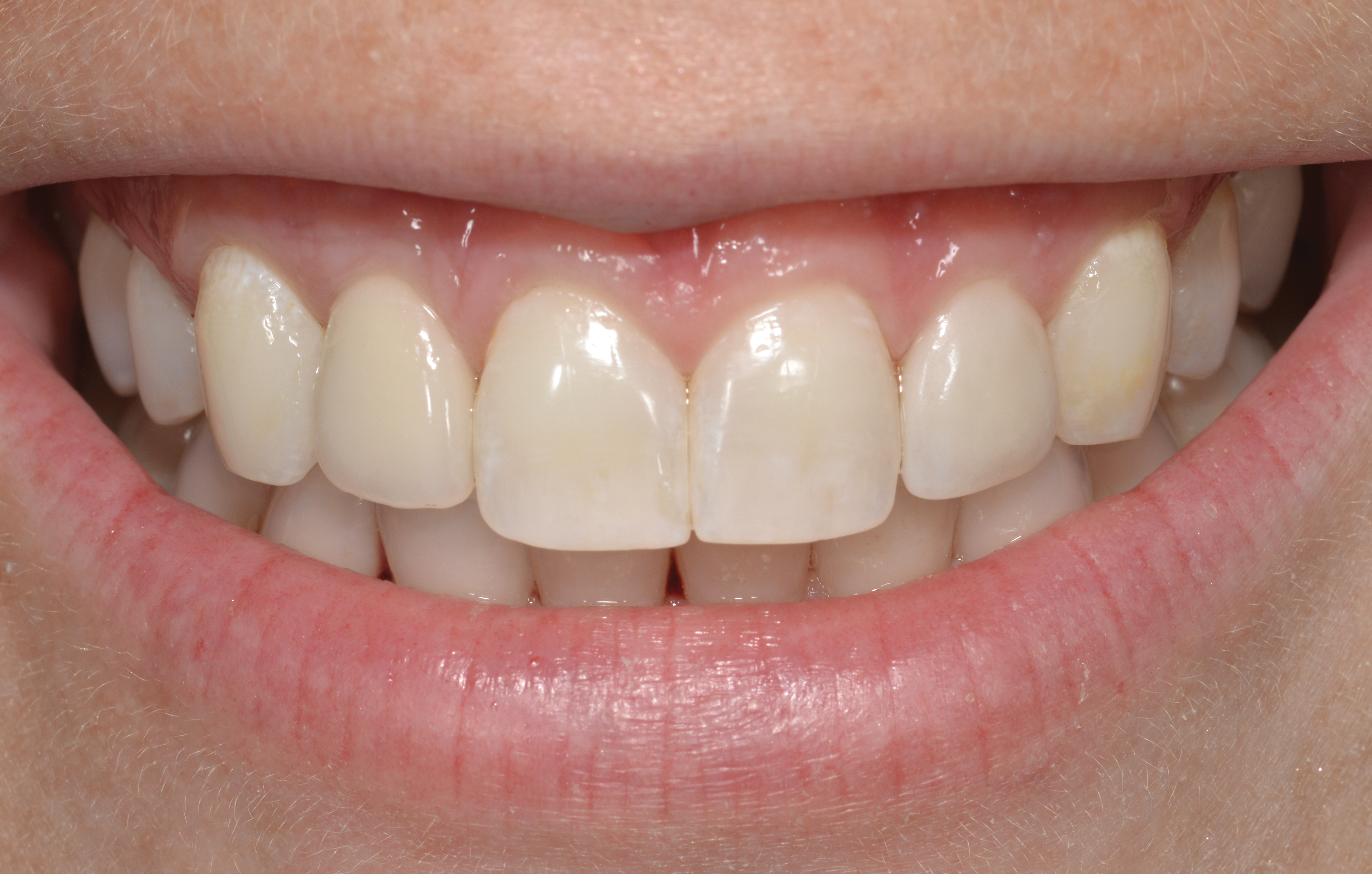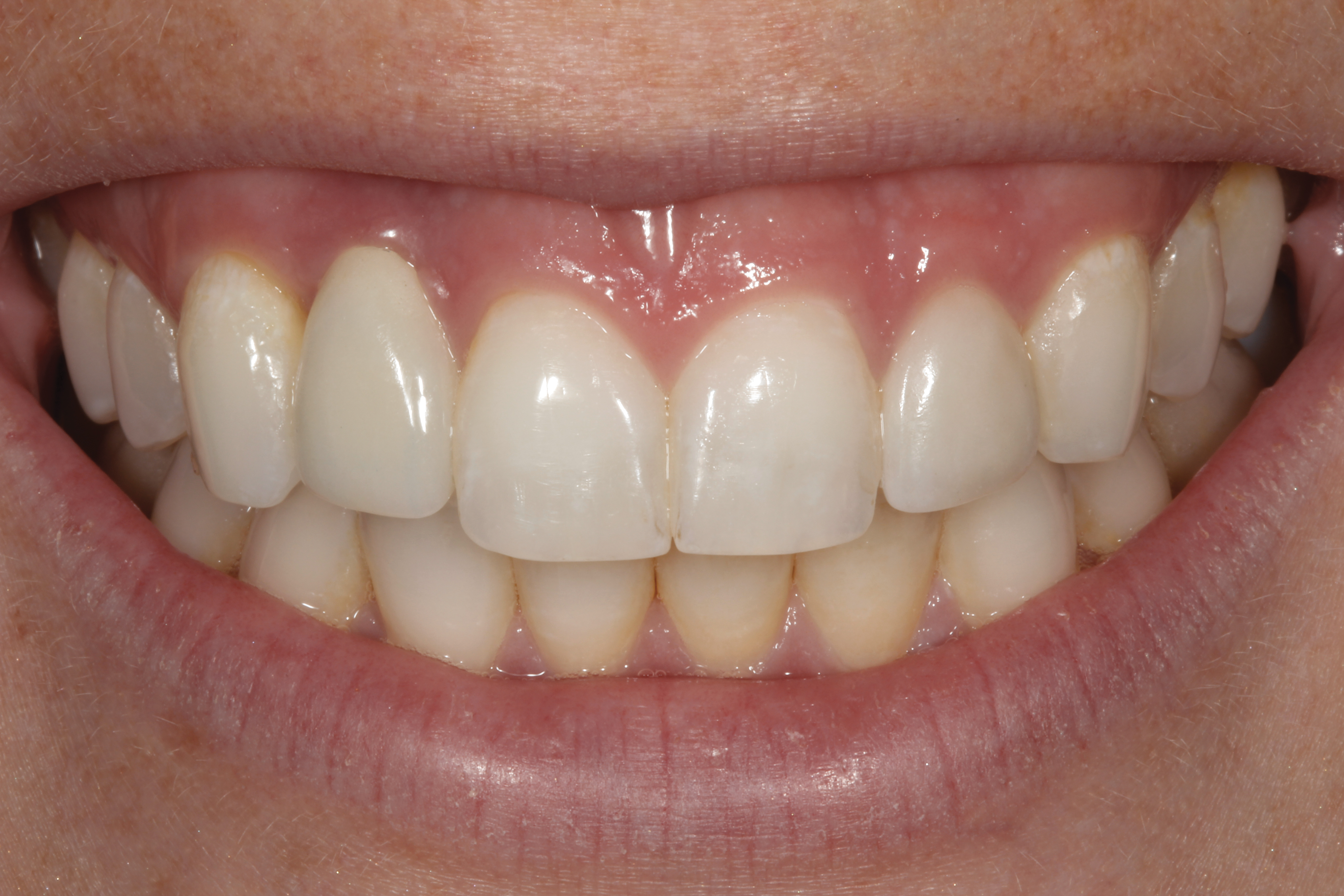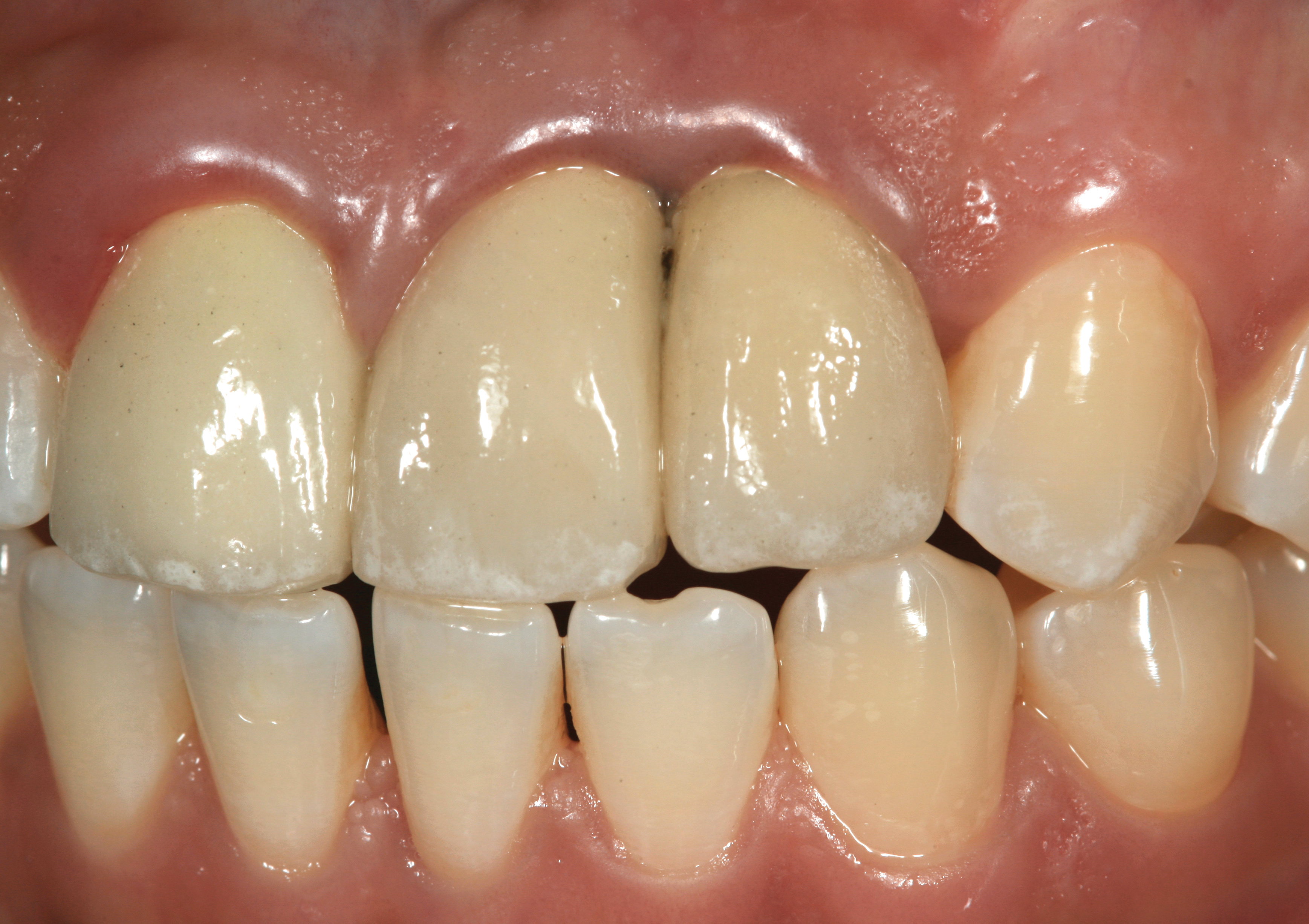 It was determined that additional augmentation was required to increase the soft-tissue volume, so a subepithelial connective tissue graft was acquired from the palate (Figure 8),23,24 placed, and allowed to mature for at least 3 months. Second-stage implant undercovering surgery with a palatal-biased incision was performed after tissue maturation to further thicken the labial soft tissues. In addition, a flat contoured healing abutment was placed to allow the soft tissues to mature without risk of recession, and the RBR replaced (Figure 9). After 4 to 6 weeks of healing, a flat contoured screw-retained provisional restoration was inserted (Figure 10) with the proper submergence profile to restoratively sculpt the soft tissues. An implant-level impression was made and the definitive cement-retained metal-ceramic restoration fabricated and inserted (Figure 11 through Figure 13). The final esthetic outcome to restore the proper length and proportion of the right lateral incisor to match that of the contralateral incisor was accomplished using the treatment steps outlined above, where the mucosal tissues were augmented after implant decoronation (Figure 14).