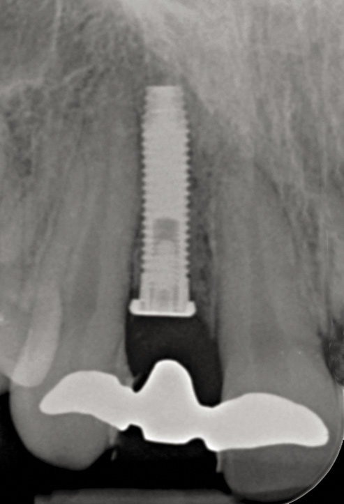 Solution: Using a reverse-torque device on high, remove the implant with minimal trauma to the surrounding periodontium. Let the area heal like an extraction socket and place a new implant in the proper position 8 to 10 weeks later. Restore the implant, which will now be in a better restorative and esthetic position, with either a screw- or cement-retained crown.