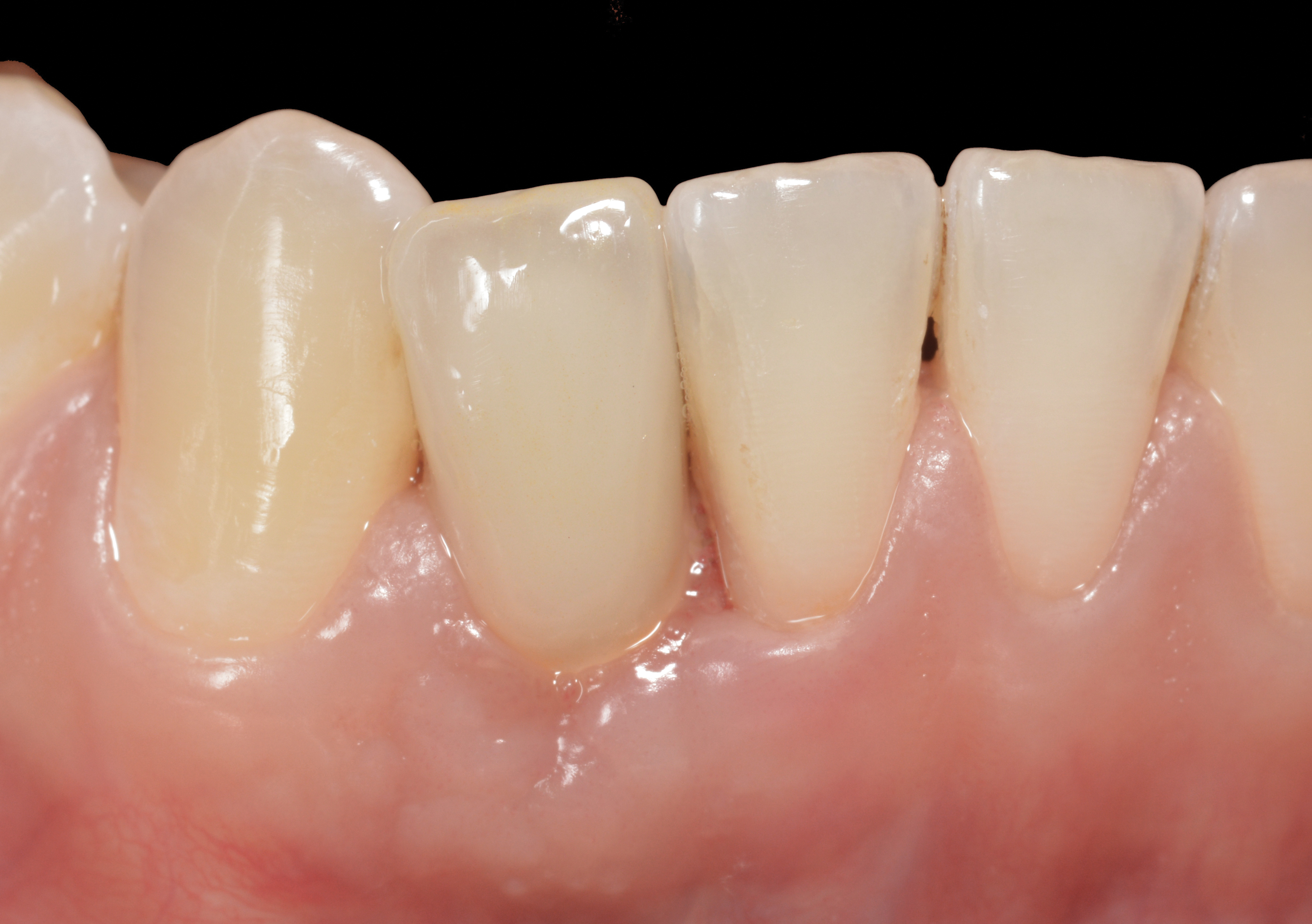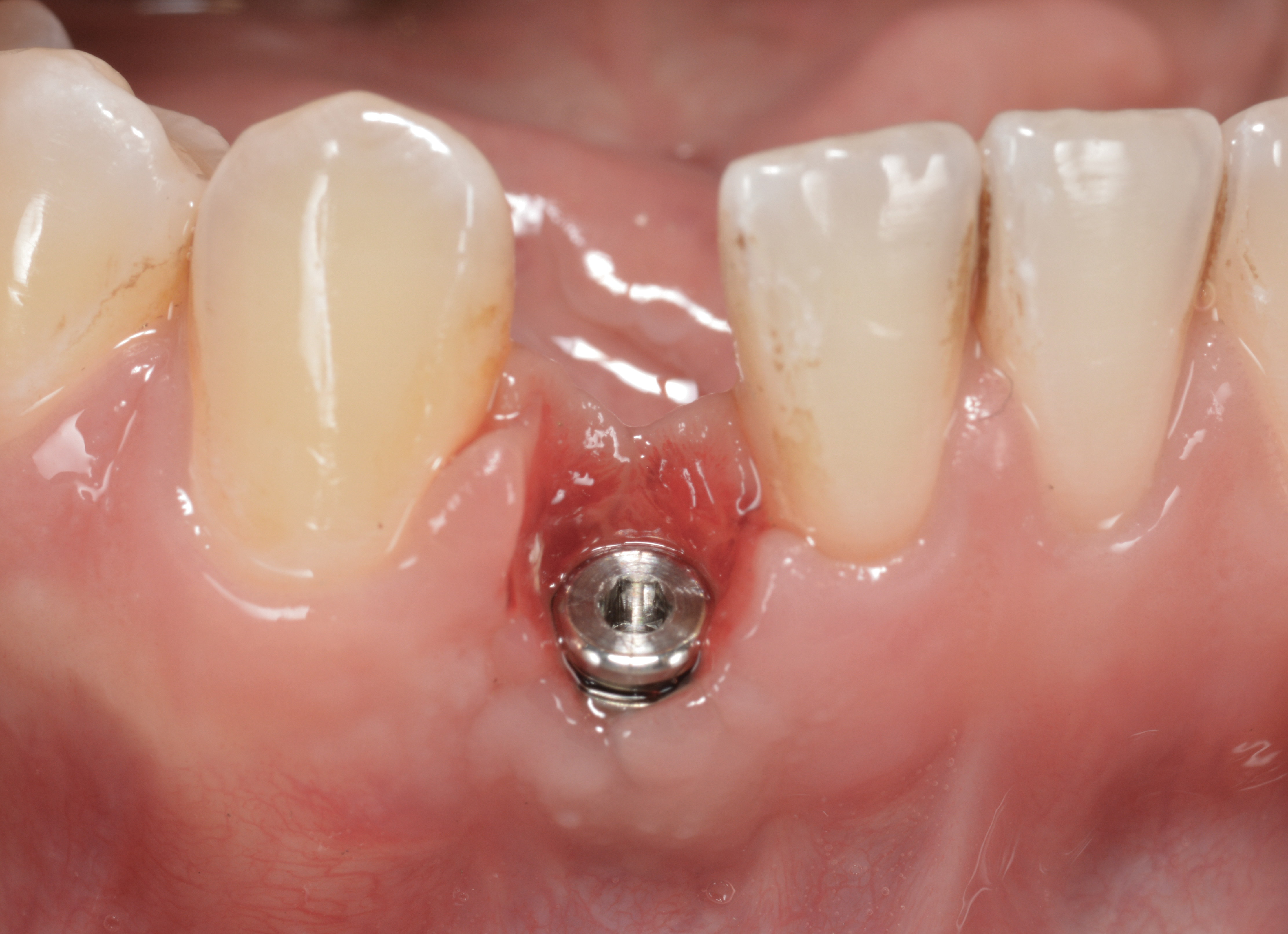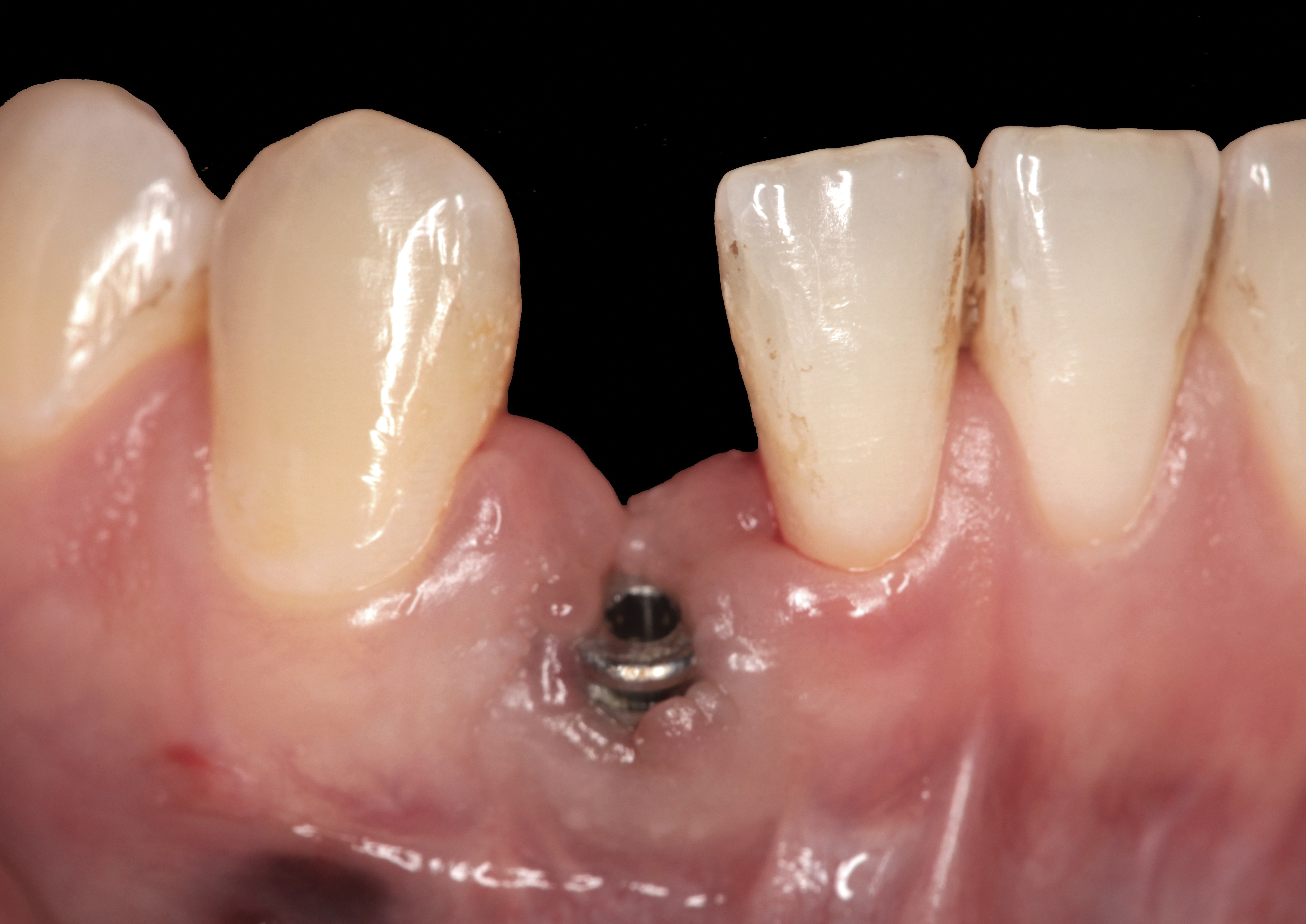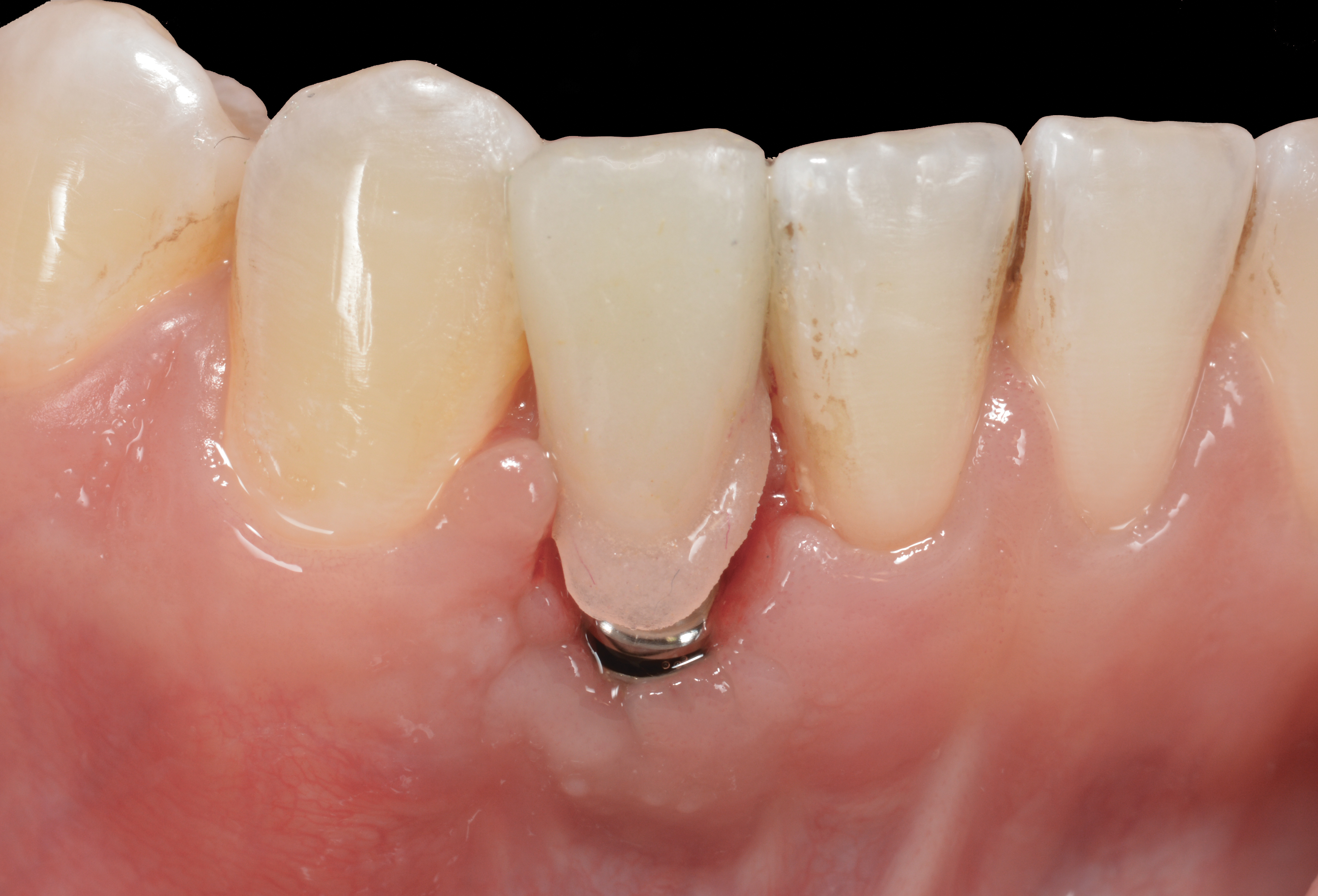 Problem: The implant is placed too facially, and there is significant labial gingival recession, contour change, and mucosal discoloration around the implant, abutment, and crown (Figure 3 and Figure 4). The implant attachment apparatus is intact and healthy, but the patient has a thin periodontal phenotype.