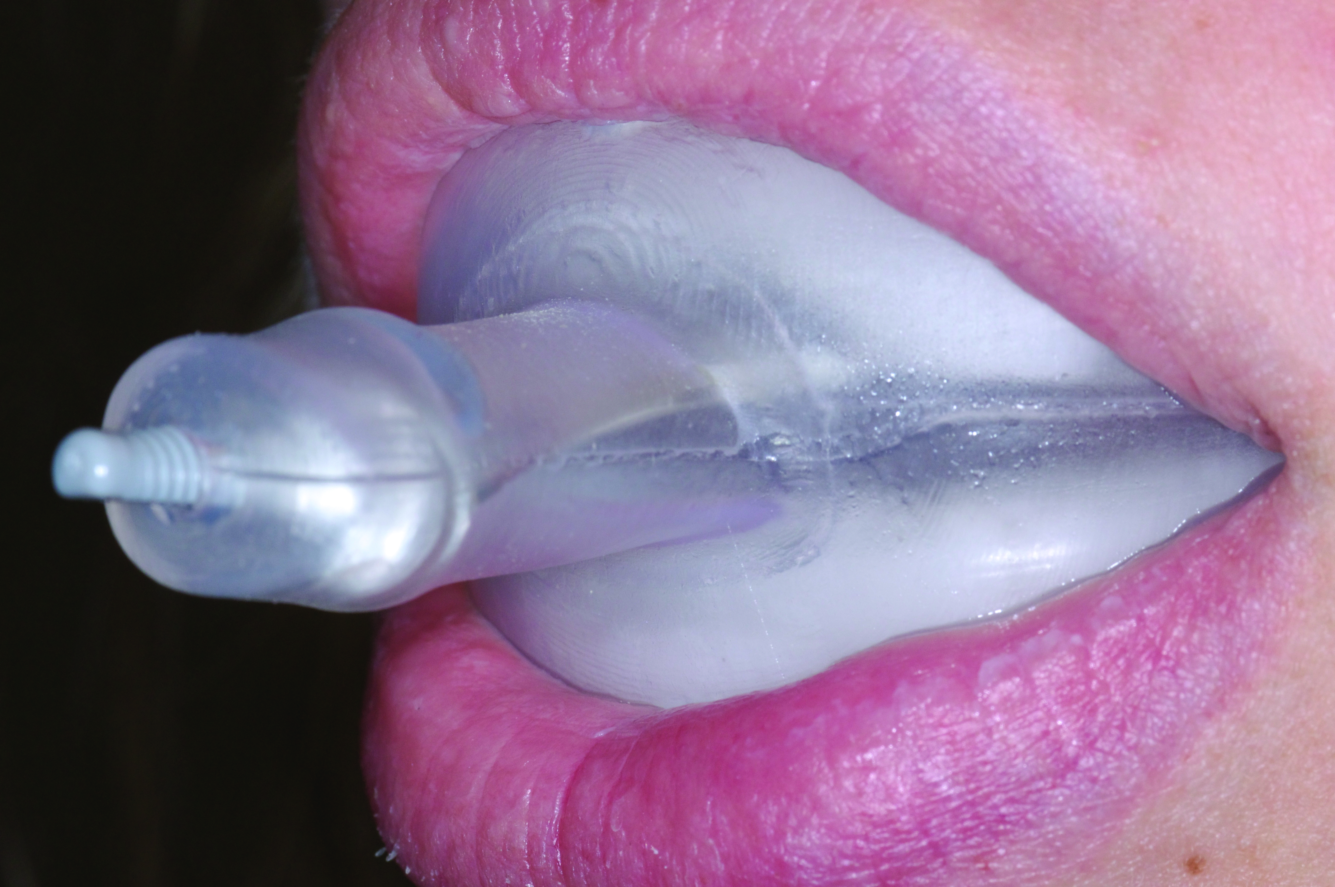 The provisional oral appliance used in the ANS trial is an irradiated thermoplastic device (Figure 4) with a design that allows it to be modified to almost any arch size and configuration. Vertical adjustment shims are available that enable easy, predictable modification of oral volume. The initial protrusion is set at no more than 2 mm to 3 mm for the first week. Because the appliance breaks the patient’s lip seal, it may introduce unwanted oral breathing (Figure 5). Therefore, mouth tape or an oral shield should be used with the appliance. If the initial protrusion position does not improve sleep after the first week, a routine MAA titration sequence is employed until subjective success is achieved (Figure 6). The ANS trial lasts no longer than 3 months. At each step, both success and failure are valuable outcomes.