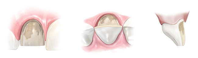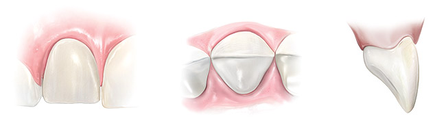 Many times considered the best option because of their tooth structure preservation qualities, prep-less veneers have limitations, including esthetic outcomes. Calamia found that veneers placed with no preparation resulted in periodontal problems as a result of over-contoured teeth that changed the emergence profile.2,51 It was concluded, however, that the veneer treatment modality would function long term.2,3 To correct the emergence issue, a 0.5-mm reduction restored by 0.5 mm of porcelain provided nearly the original tooth profile with the veneer in place.2 Additionally, it was discovered that wrapping the incisal edge enhances strength, and that preparations limited to the facial surface only were not as strong as those with a wrapped incisal edge.2,43 This latter veneer preparation type is described below as CL-II.