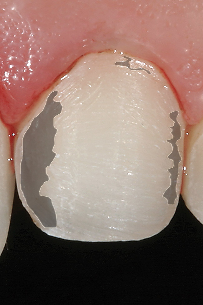 When preparations fall outside these parameters (Figure 15), a crown should be considered for predictability and longevity. It is well established that when a tooth has greater than 50% of enamel missing (Figure 16), moderate sclerotic dentin, and greater than 3 mm of unsupported porcelain, a crown must be considered. Magne found that 65% of a tooth’s integrity comes from the cingulum and approximately 27% from lingual marginal ridges.55 These anatomical landmarks must be preserved at all costs.55 No significant differences in crown flexure were found between natural and veneered incisors when the cingulum is presevered.56
