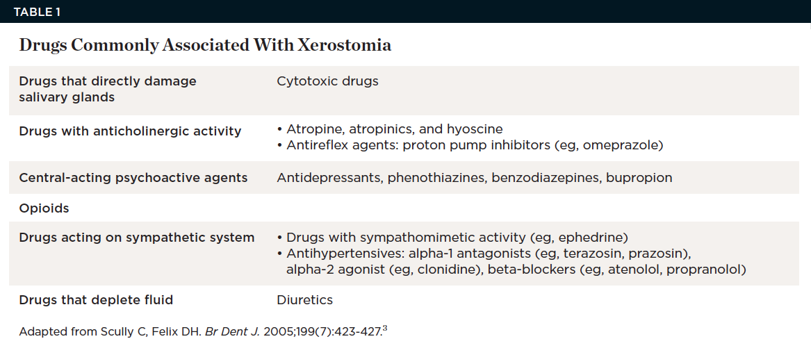 Table 1 provides a summary of drugs commonly associated with xerostomia.