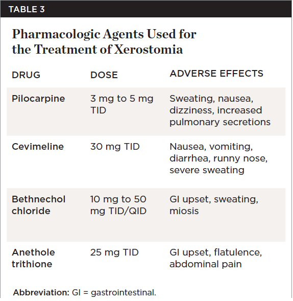 Table 3 lists the pharmacologic agents used for the treatment of xerostomia along with their recommended doses and the adverse effects associated with their use.