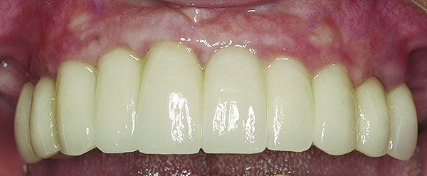 Accordingly, if an increased rate of bone loss was selected to represent the pace of osseous resorption under dentures, a comparison between the rates of bone loss under dentures and around implants would indicate that implants preserve bone. Furthermore, the preponderance of data document that usually the amount of bone reduction per year around implants, in the absence of peri-implantitis, is so small that it has a negligible effect on the survival of implants, and it would take years to manifest noticeable bone loss and recession. For example, in areas under implant-supported prostheses (Figure 15), the ridge does not routinely manifest bone resorption and recession.66,67 However, there are patients who demonstrate different degrees of bone loss, and the reason for this is unknown.