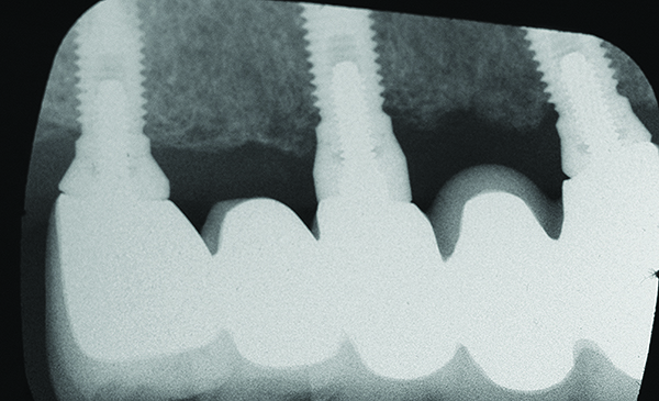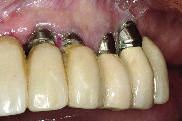 This assessment presumed patients were healthy. However, there are situations that can contribute to bone loss and individuals may experience a greater amount of osseous resorption than reported in this evaluation: systemic conditions (eg, diabetes, osteoporosis); smoking; medications (eg, bisphosphonates)90,91; subgingival cement retention92 and peri-implantitis; and in some patients, time appears to be a factor (Figure 16 and Figure 17).93 Furthermore, there are patients that lose more bone around implants than expected in the absence of recognized risk factors. It could be speculated that occlusal forces contributed to this, but that is also controversial.94
