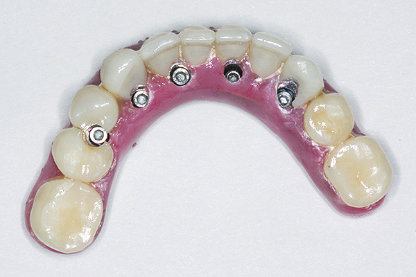 The benefits of cross-arch stabilization have been described above. The drawback of any one-piece design is the difficulty in repairing any such restoration. This can be avoided by having a full-arch framework that supports removable screw-retained PFM segments (Figure 13 and Figure 14) or individually CAD/CAM-milled cemented crowns (Figure 15 through Figure 18). This combines the strengths of a one-piece restoration with easier maintenance.