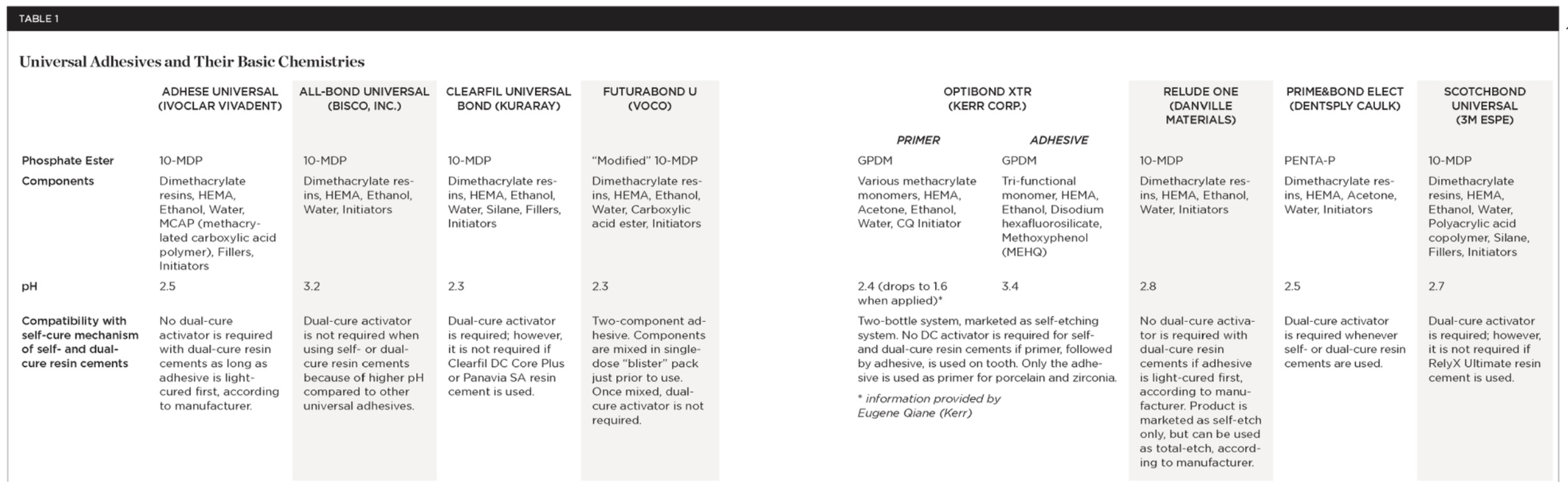 Table 1 lists eight products that are marketed as universal adhesives, along with their basic chemistries.