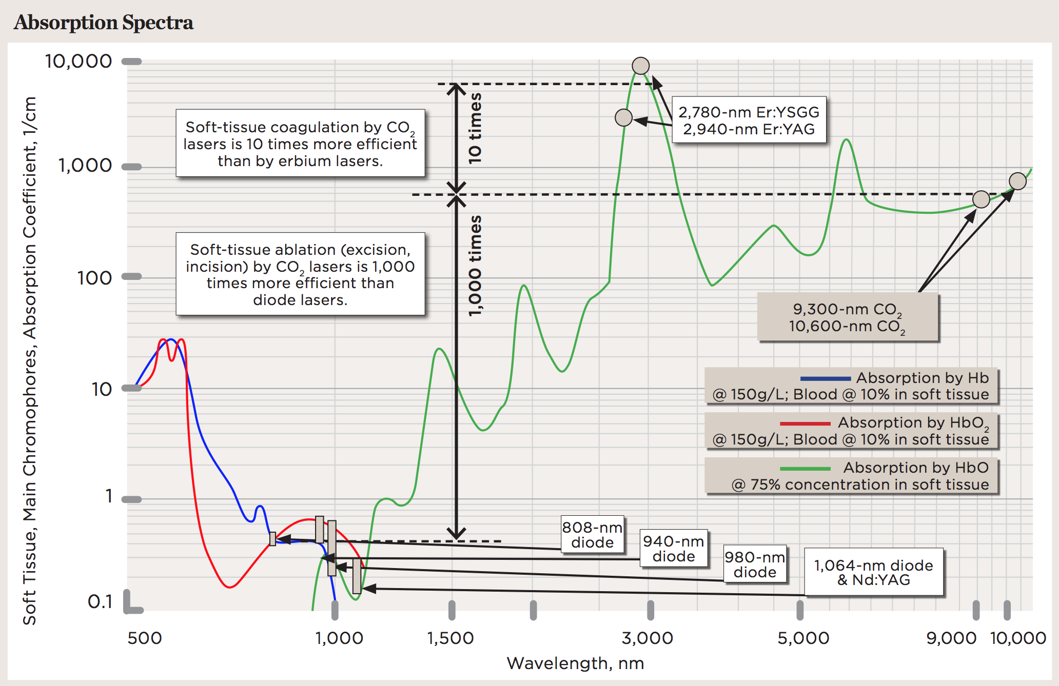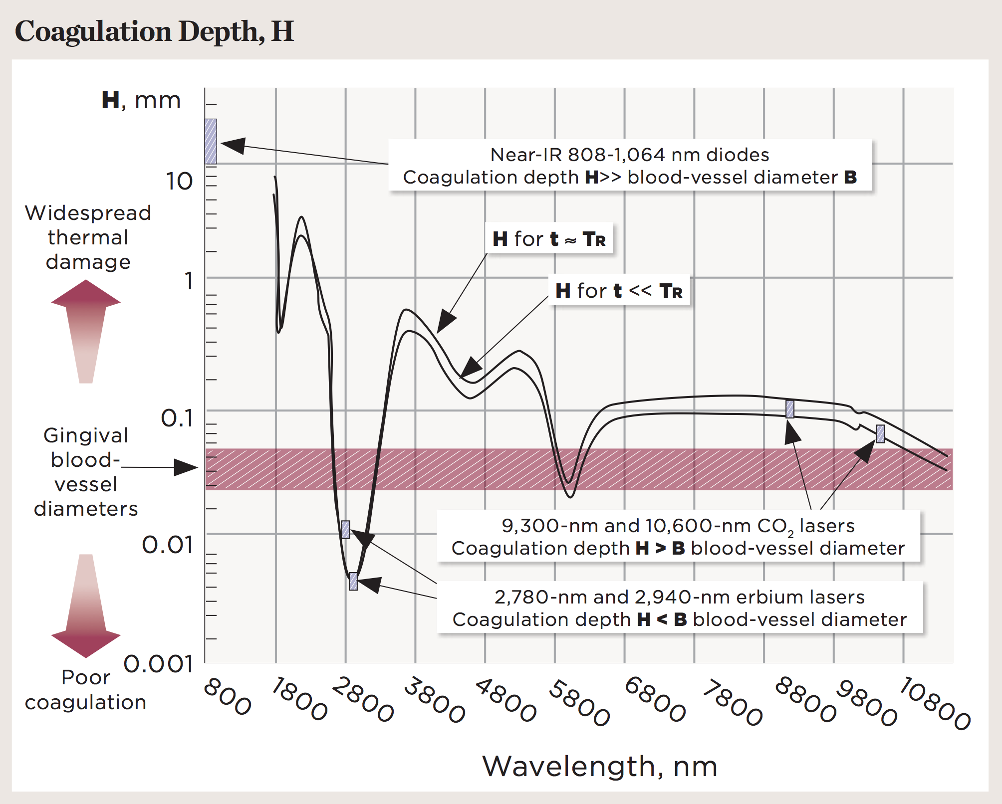 Not all lasers are equally efficient at both tissue vaporization (ie, ablation, cutting) and coagulation. The difference is illustrated in the absorption spectra for main soft-tissue chromophores10,11 in Figure 1. Some dental laser wavelengths (approximately 3000 nm, such as erbium lasers) are well absorbed by the water-rich soft tissue and are excellent for ablation but not as efficient at coagulation.11 Other dental laser wavelengths (approximately 1,000 nm, such as diode and Nd:YAG lasers) are efficient at coagulation but inefficient at ablation12 because they are poorly absorbed by the soft tissue.