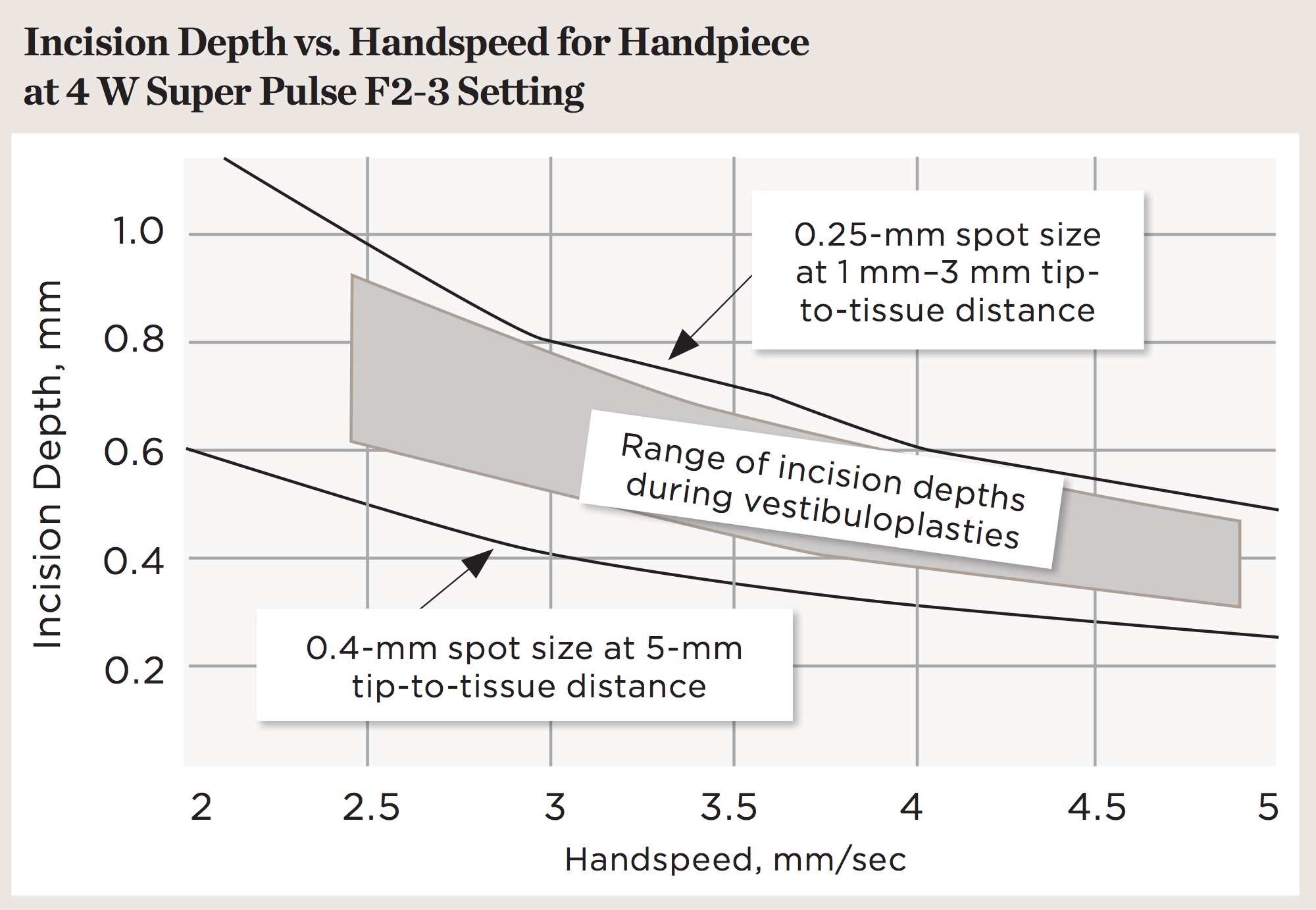 For a laser, the power density of the focused laser beam is equivalent to the mechanical pressure that is applied to a traditional scalpel blade. In other words, greater laser fluence11 (ie, greater power density, slower hand speed) results in greater depth and rate of soft-tissue removal. When repetitive pulses are scanned across the soft tissue, the fluence is defined by the pulse frequency and the handspeed; in other words, the depth of incision depends on laser power settings, spot size, and the surgeon’s handspeed10,15 (Figure 5).