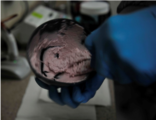 In the traditional denture creation process, the first visit is critical because that is when perhaps the most crucial step is taken: the impression. A well-made impression will save a dentist from complications later. The consistency of the mixture used must be precise (Figure 1). The mixture must be given enough time to set. After the impression is taken, the mixture should be poured immediately. The second visit is when the most time will likely be spent with the patient. This is when the patient's vertical dimension of occlusion (VDO), vertical dimension of rest (VDR), midline, and smile line are measured (Figure 2), in addition to a bite registration being taken.