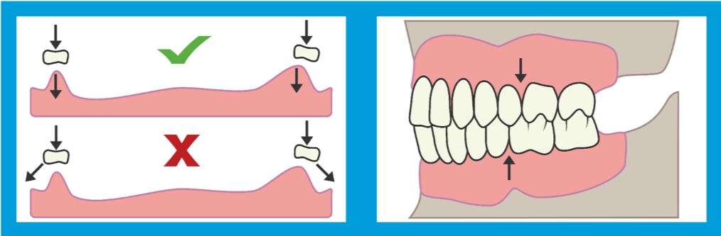 During the third visit, the artificial teeth are tried in and occlusion checked. Occlusion is one of the most important factors affecting denture stability (Figure 3). Vertical forces on the denture base lying over the resilient tissue will produce lever forces on the denture. Vertical forces acting outside the ridge crest will produce tipping of the denture. The clinician should ensure the fit is comfortable and tight. The fourth visit is when the denture is delivered (Figure 4). Any final adjustments are then made, and the dentures are polished. Reline protocol dictates that patients should come in a few times after the denture delivery. Reline can be performed in-office or sent to a laboratory.