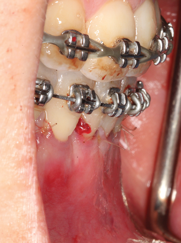 Unexpectedly, using barrier membranes has never been suggested in any description of the technique. However, in the case of fenestration and/or dehiscence around roots, if no alveolar augmentation is being performed in the direction of tooth movement where the preexisting dentoalveolar bone is thin, further bone loss may occur. This highlights the need for some consideration of using a barrier membrane to prevent such adverse sequelaes.36 The Wilckos and colleagues suggested limiting the use of the barrier membrane only to the areas receiving dental implants after debracketing.31 Nonetheless, a road map based on preoperative CBCT and clinical photos also may be used to better plan the surgery and to determine whether the grafting is needed.24 Presurgical planning is paramount for choosing the most appropriate flap design and deciding whether a bone/soft-tissue grafting is required.